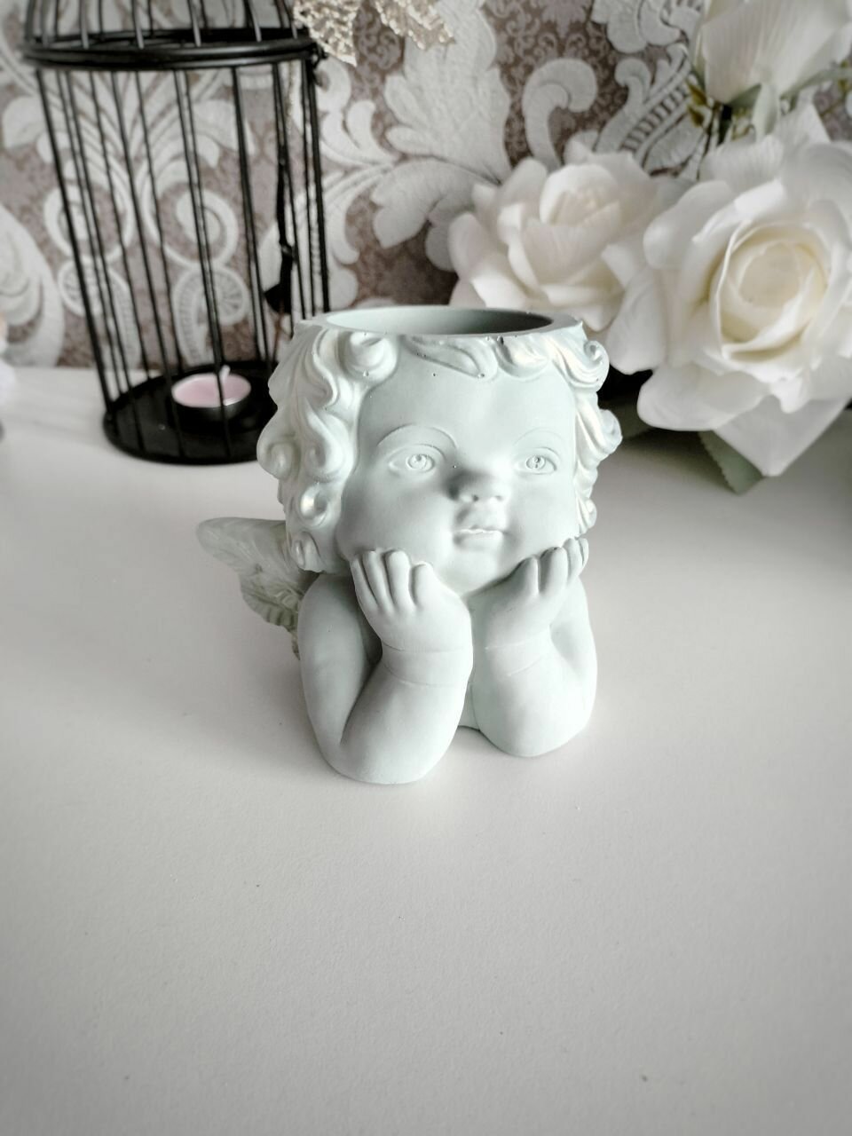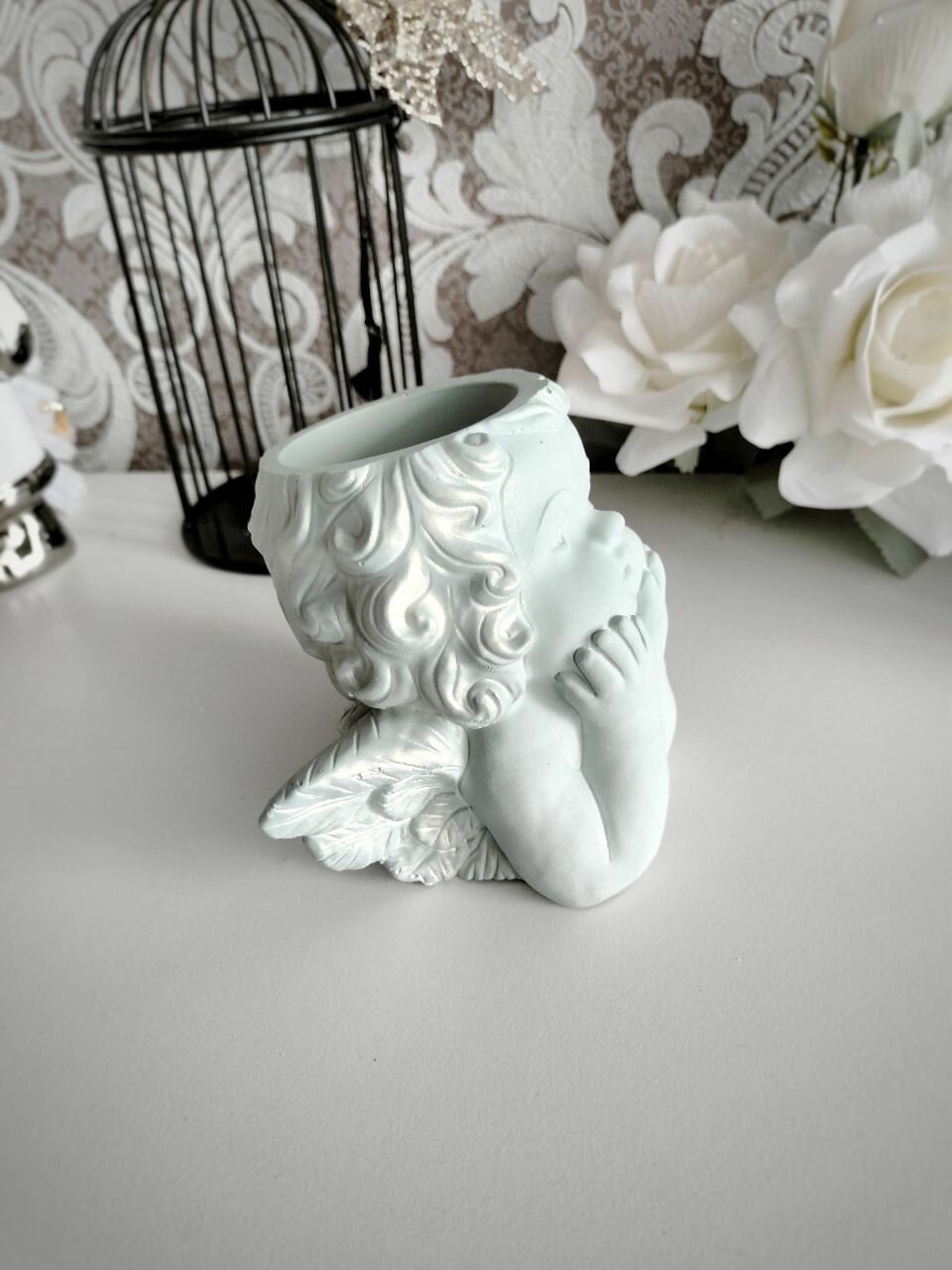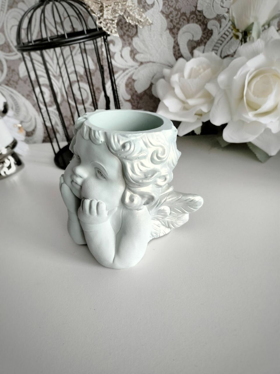 Кашпо Ангел для сухоцветов, органайзер для ватных палочек, белый с золотом