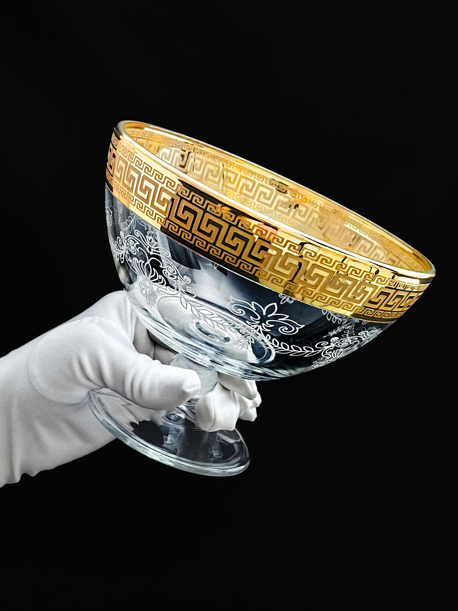 Ваза стеклянная на ножке для фруктов в подарочной упаковке с алмазной гравировкой PROMSIZ греческий узор, 1500 мл,1 шт.