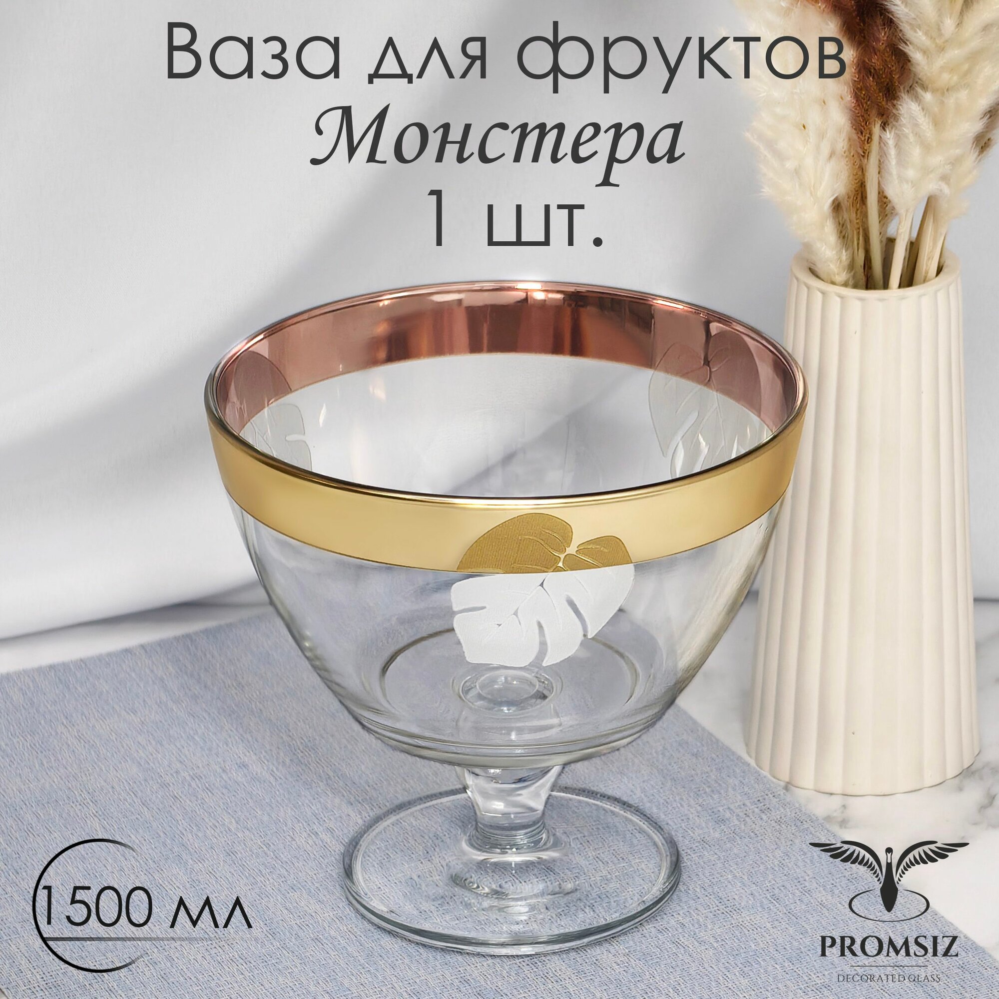 СохранитьВаза стеклянная на ножке для фруктов / конфет с алмазной гравировкой PROMSIZ монстера, d 190 мм, 1 шт. интересное: