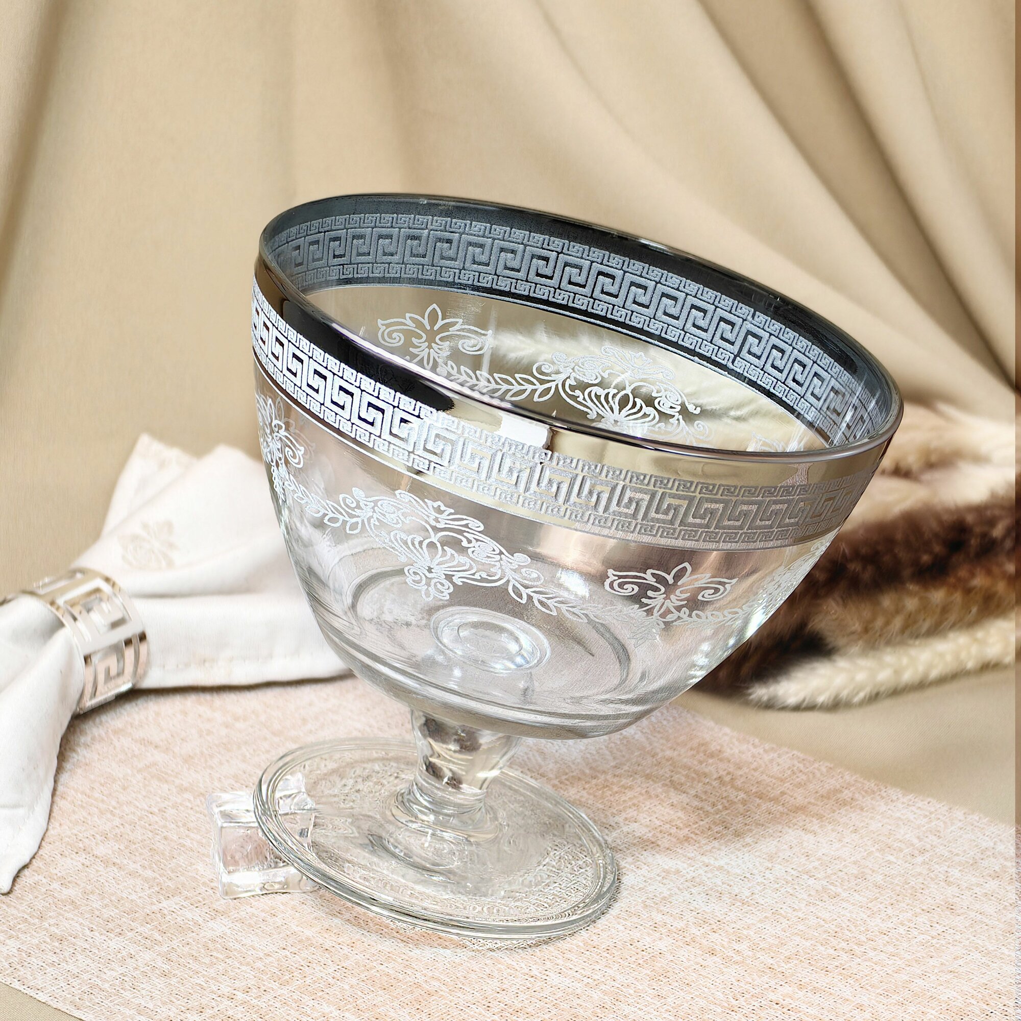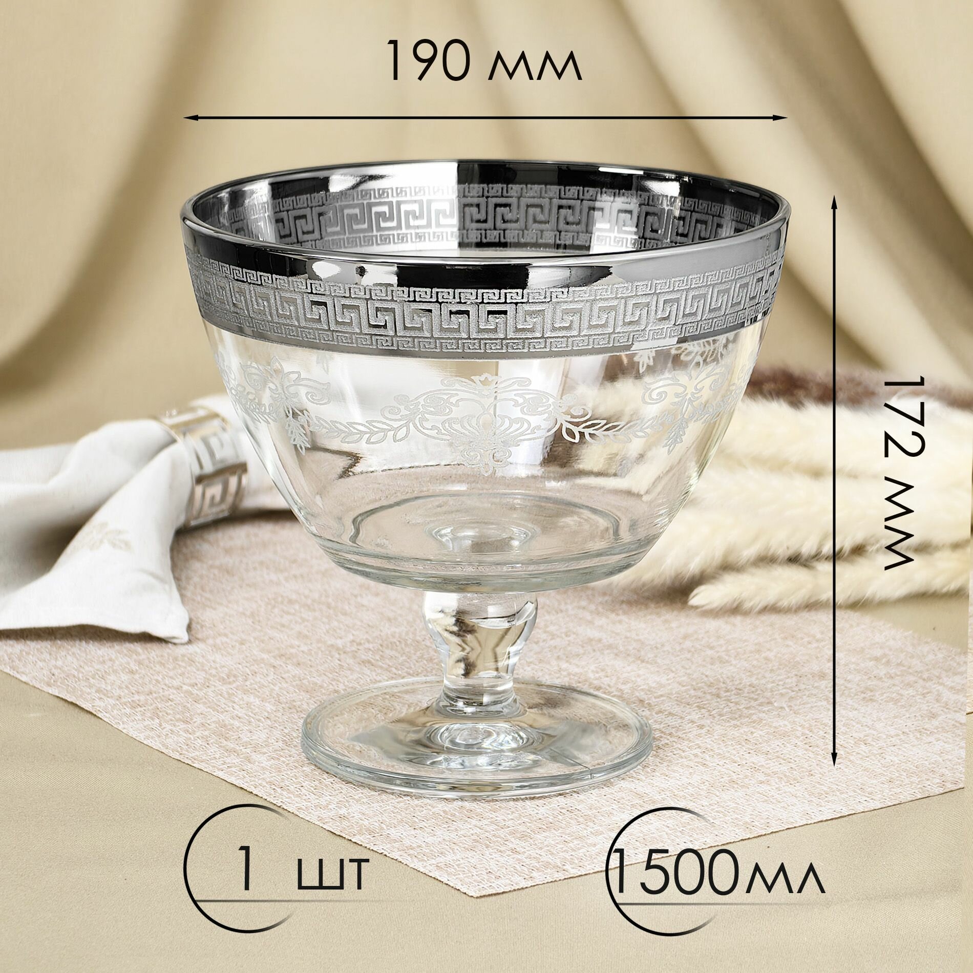 Ваза стеклянная на ножке для фруктов в подарочной упаковке с алмазной гравировкой PROMSIZ греческий узор, 1500 мл,1 шт.