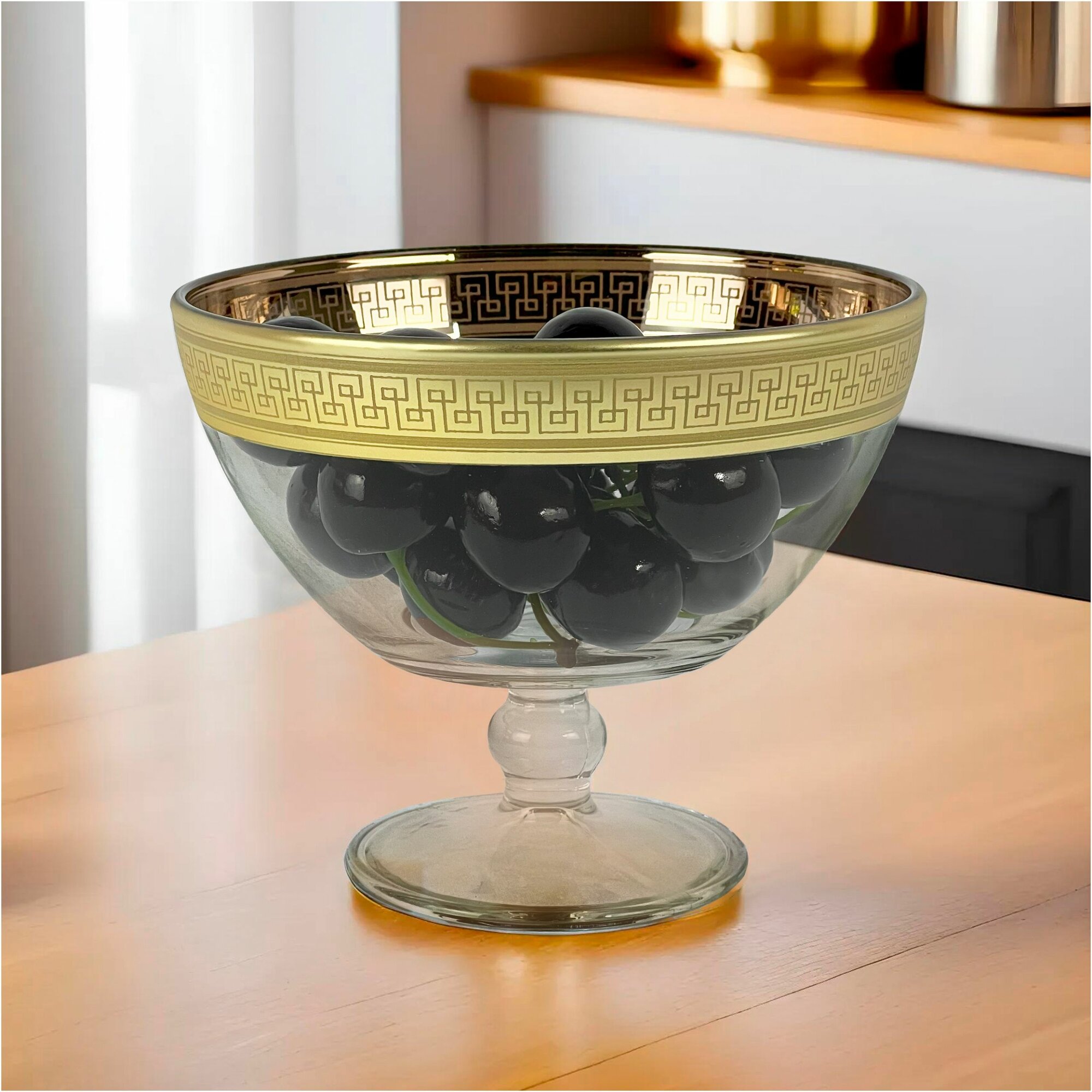 Ваза стеклянная на ножке для фруктов в подарочной упаковке с алмазной гравировкой PROMSIZ греческий узор, 1500 мл,1 шт.