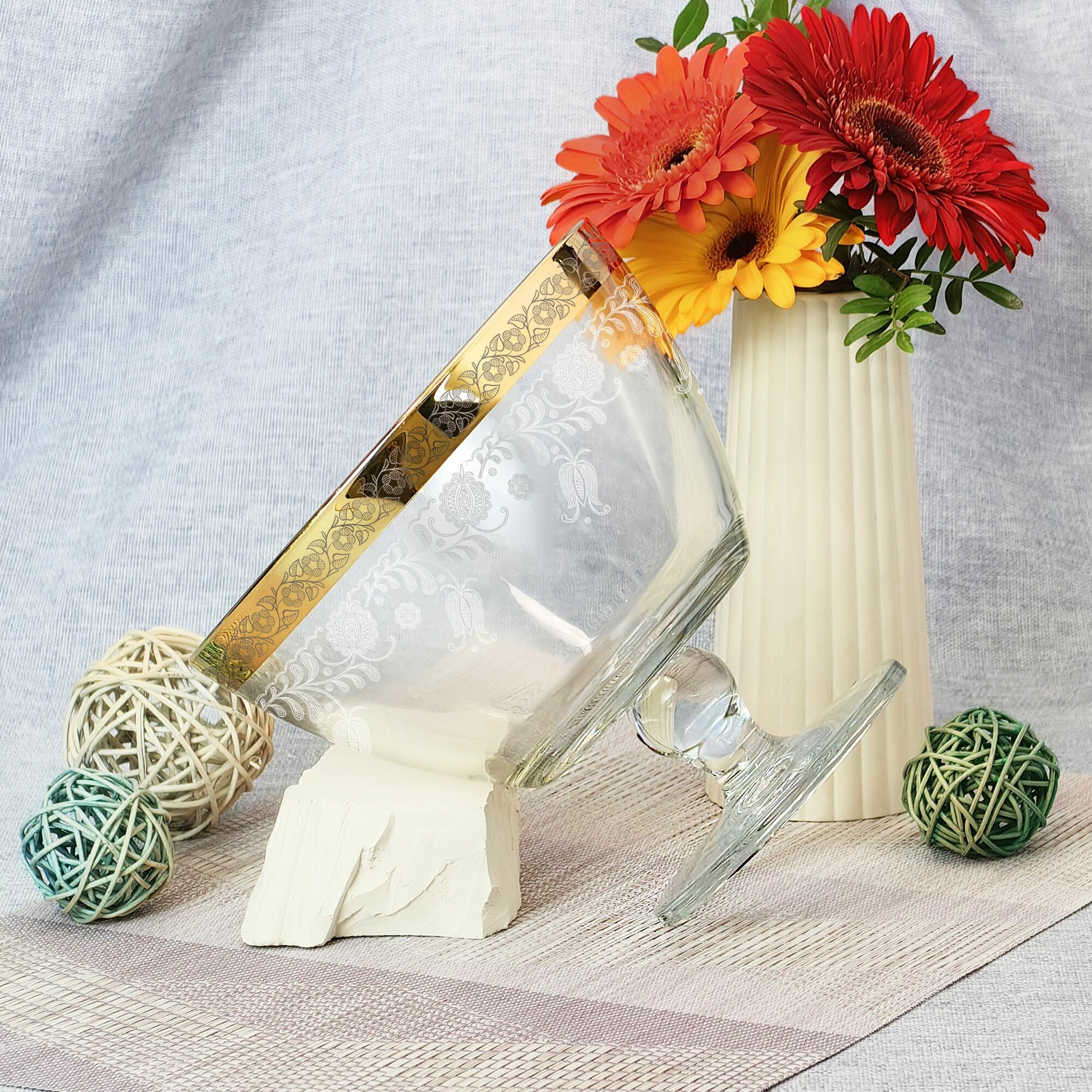 Ваза стеклянная на ножке для фруктов с алмазной гравировкой PROMSIZ весенний букет, D160 мм, 1 шт.