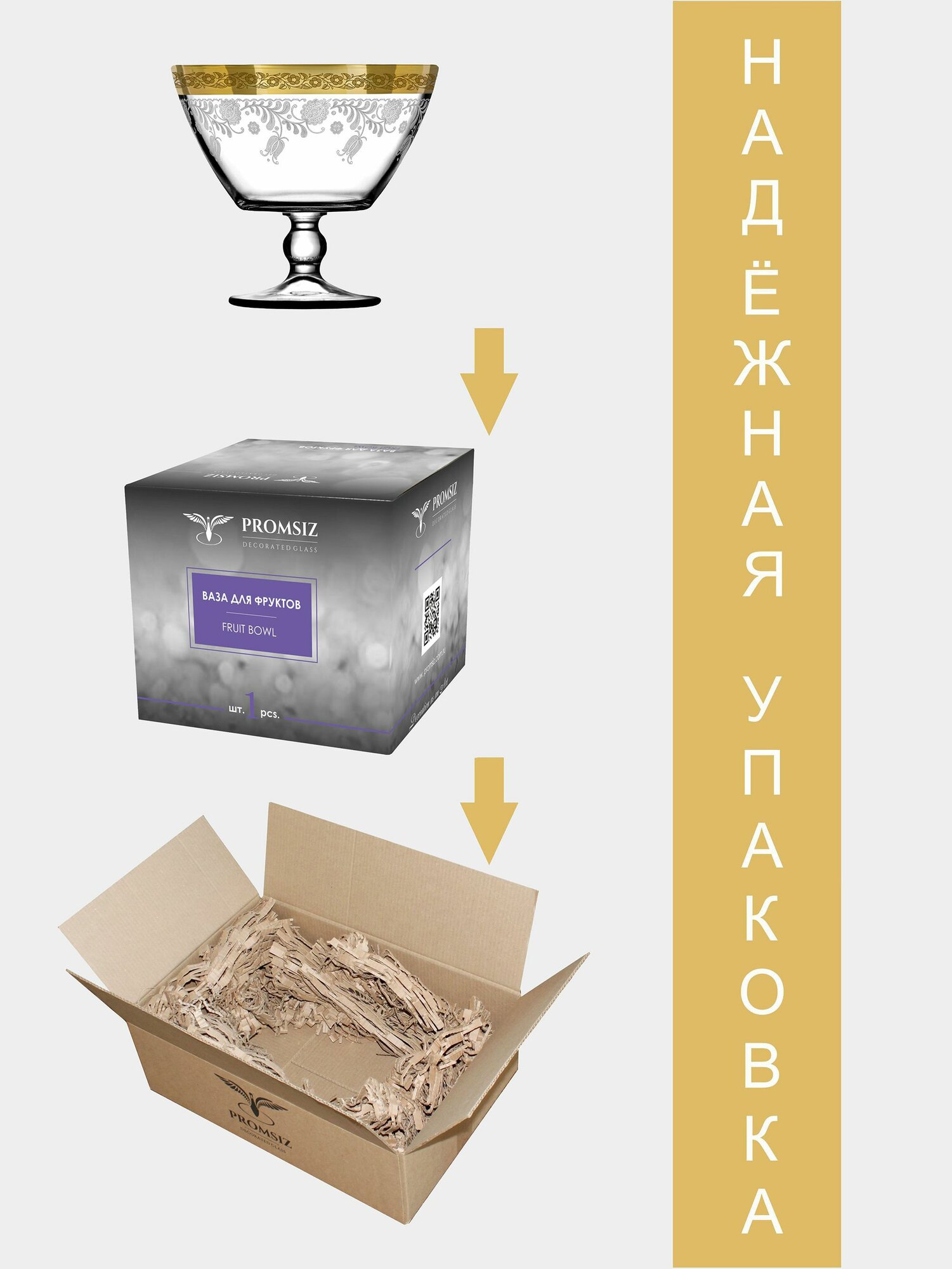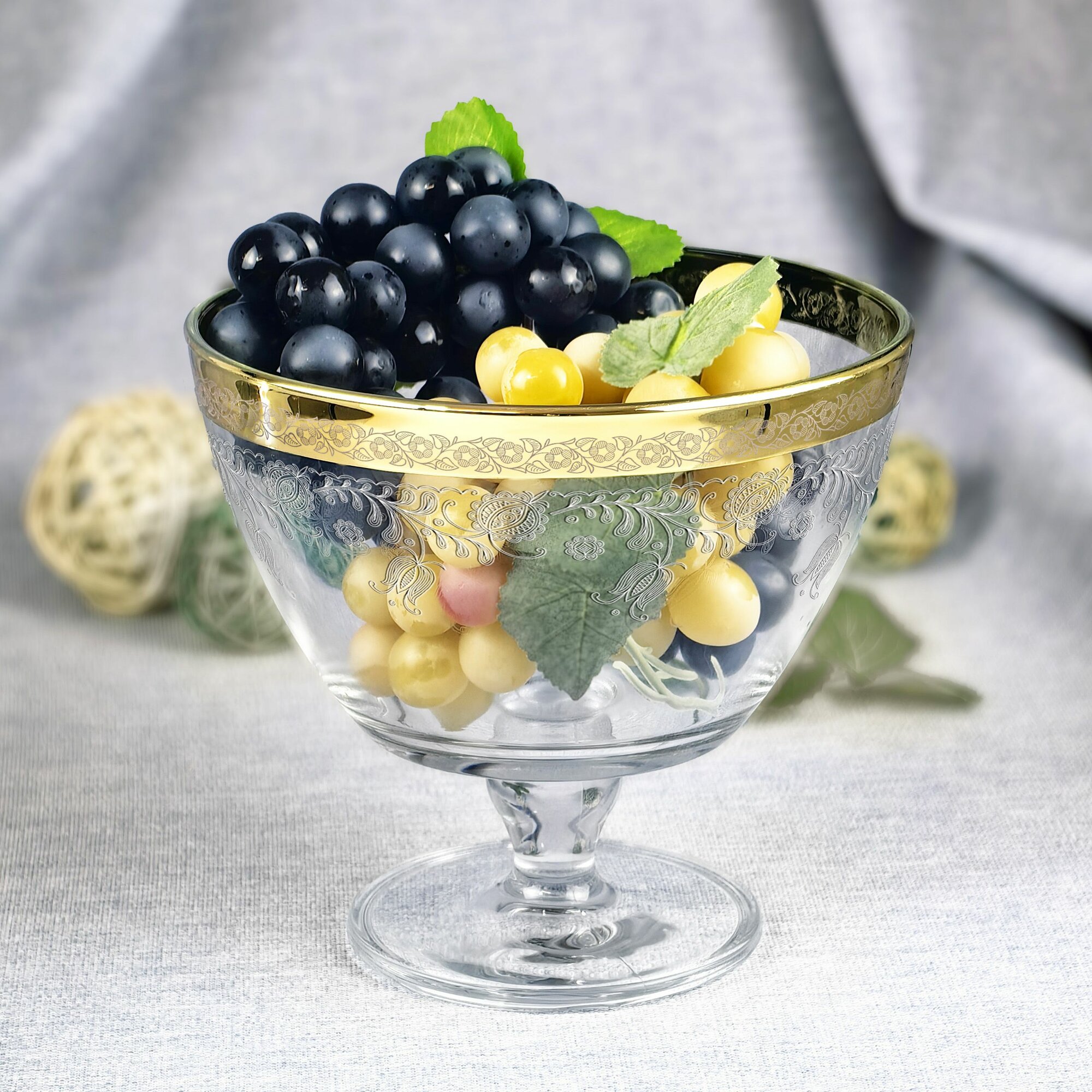 Ваза стеклянная на ножке для фруктов в подарочной упаковке с алмазной гравировкой PROMSIZ барокко, 500 мл, 1 шт.