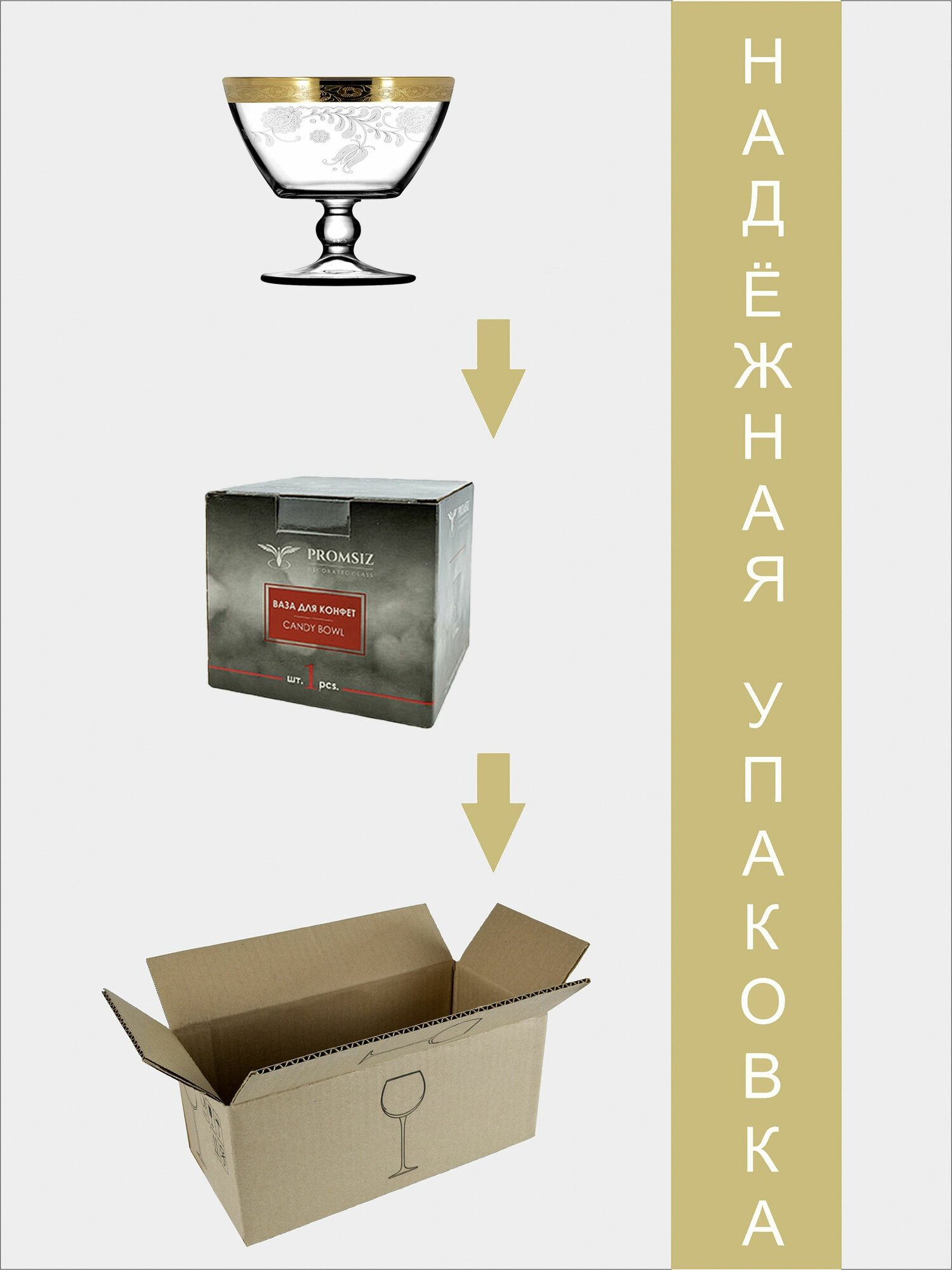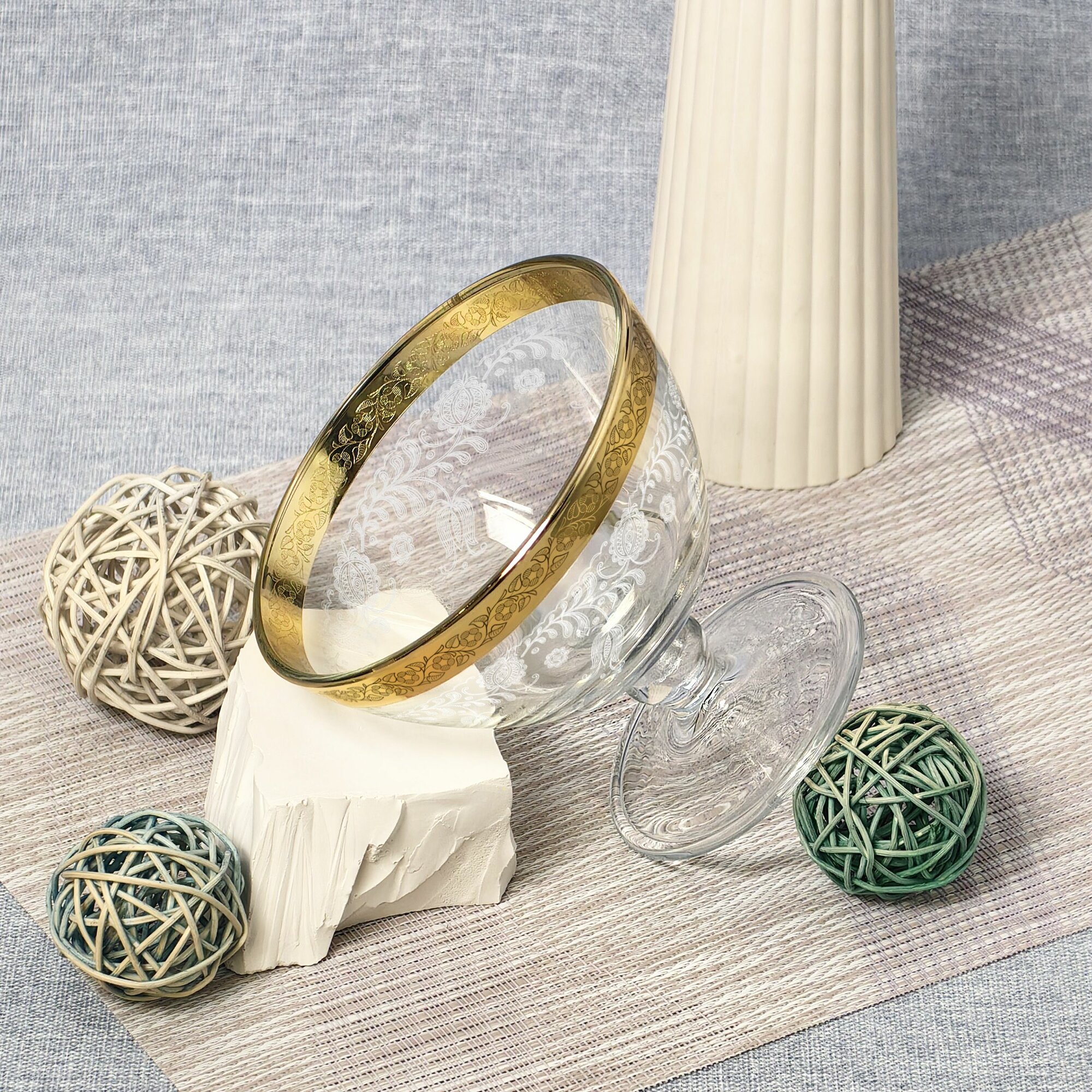 Ваза стеклянная на ножке для конфет в подарочной упаковке с алмазной гравировкой PROMSIZ греческий узор, 500 мл, 1 шт.