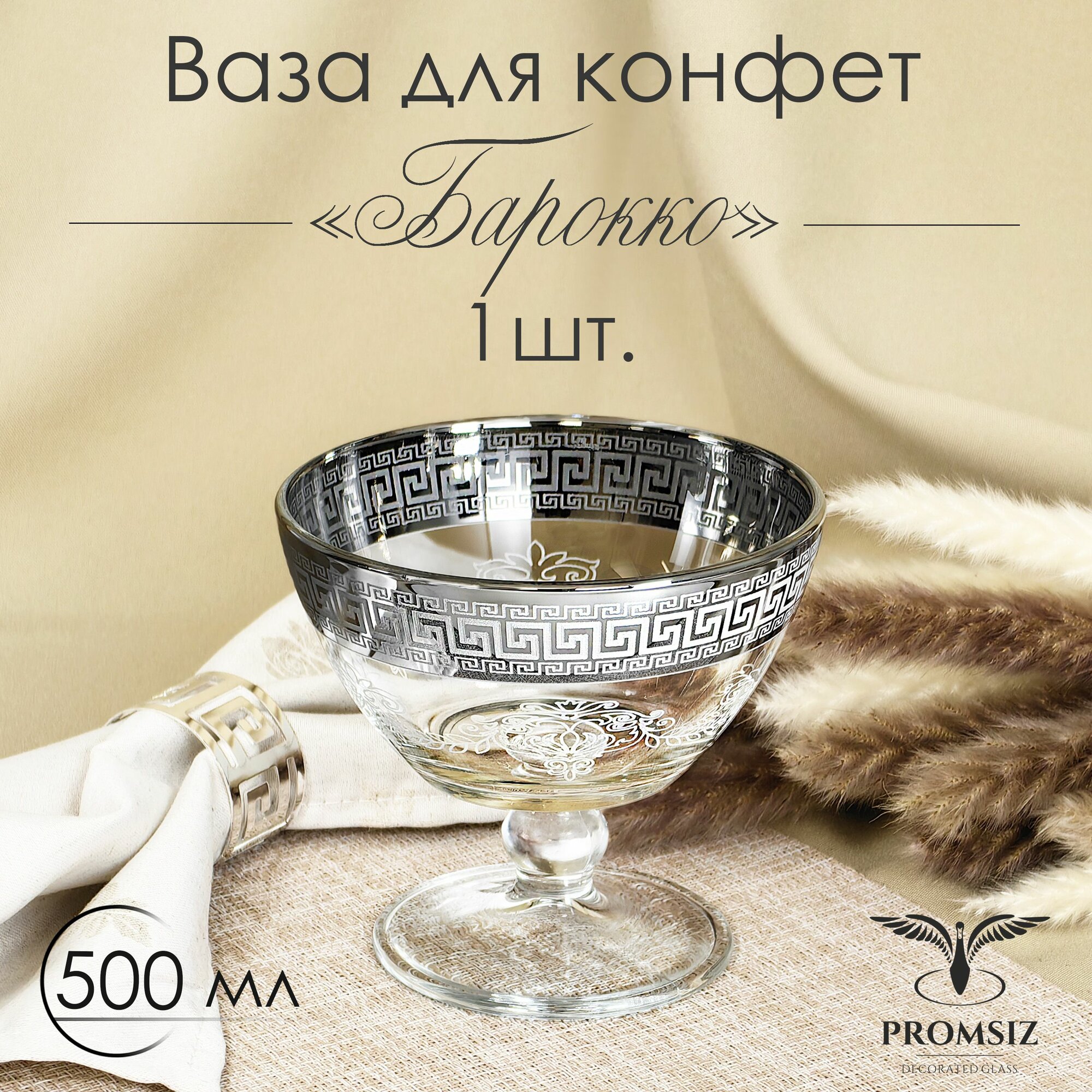 Ваза стеклянная на ножке для конфет в подарочной упаковке с алмазной гравировкой PROMSIZ греческий узор, 500 мл, 1 шт.