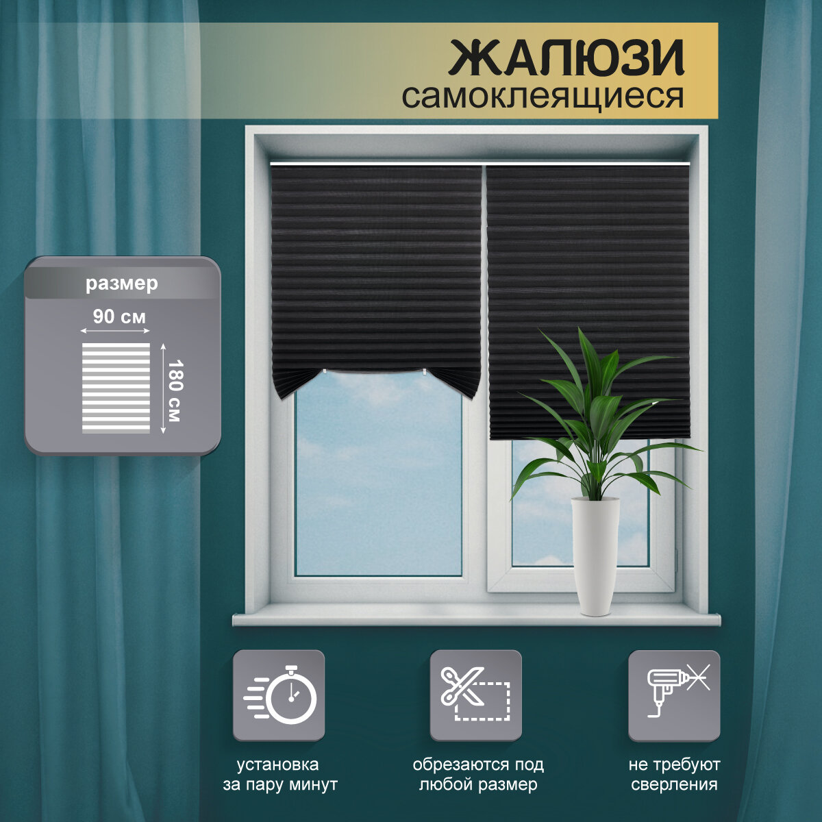 Жалюзи плиссе, чёрный блэкаут, 90х180см, самоклеящиеся, без сверления