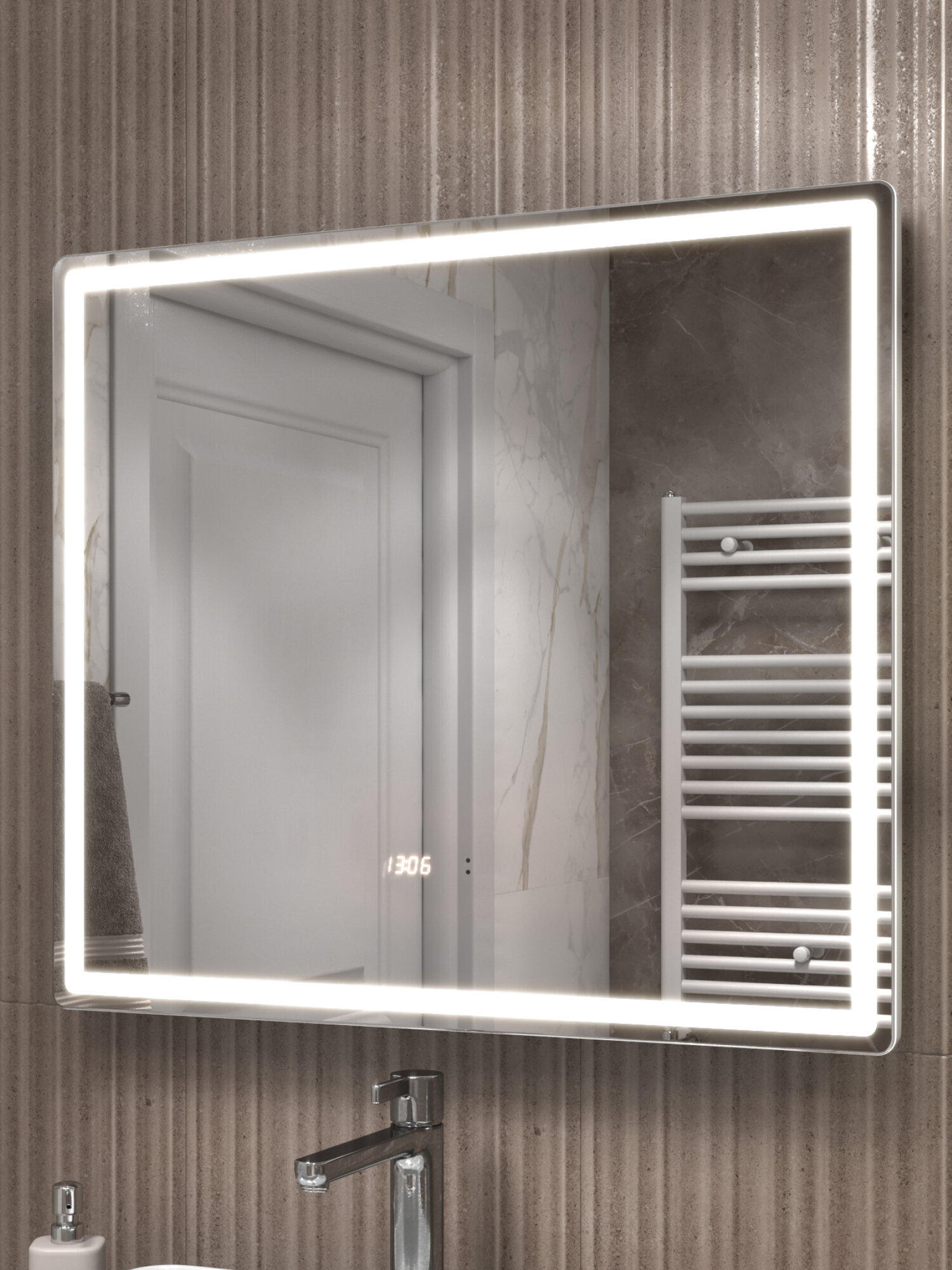 Зеркало с подсветкой в ванную 100 х 70 см Damon Luxe с бесконтактным включением на взмах, подогревом и часами, холодный белый свет 5000К