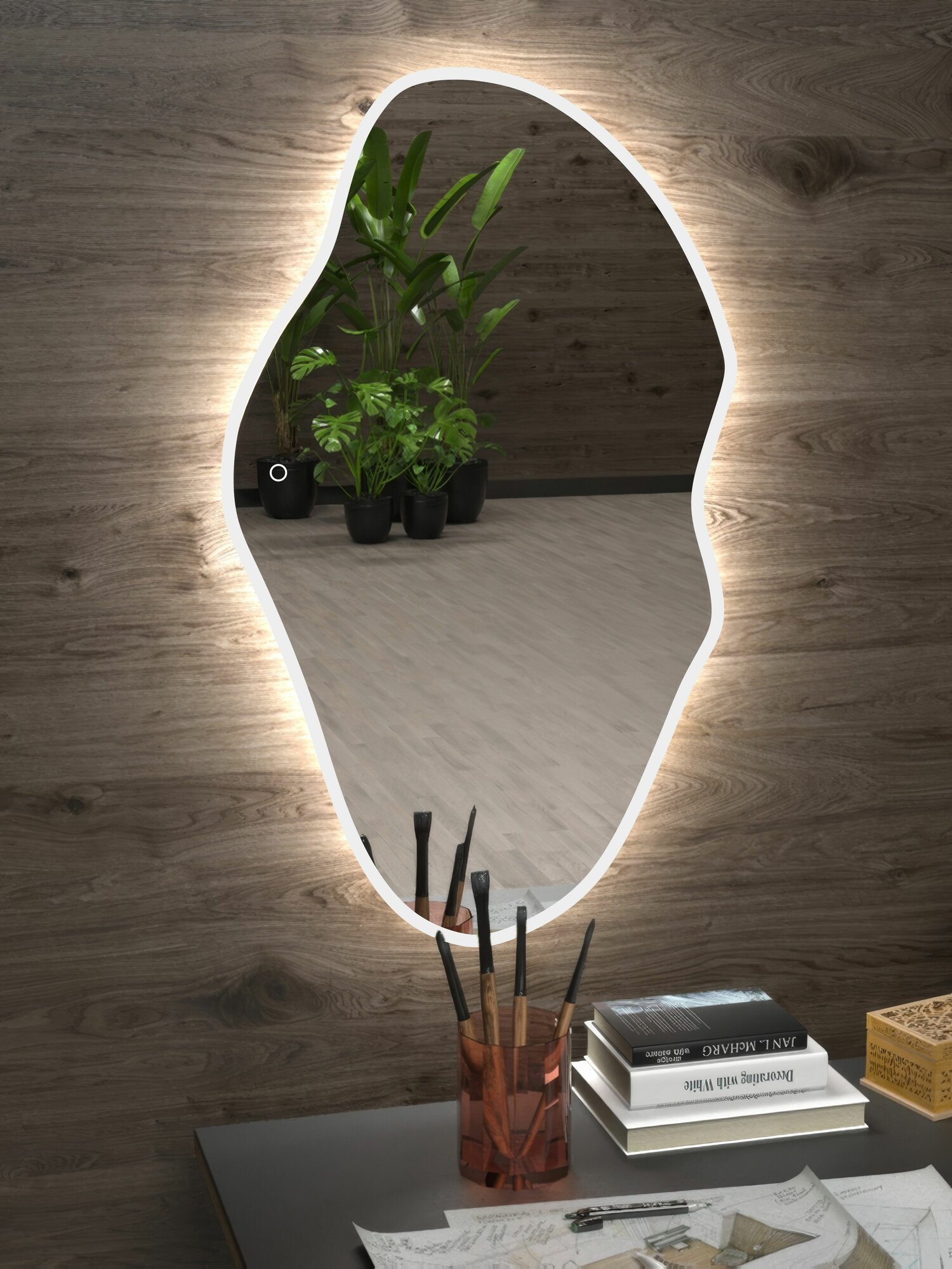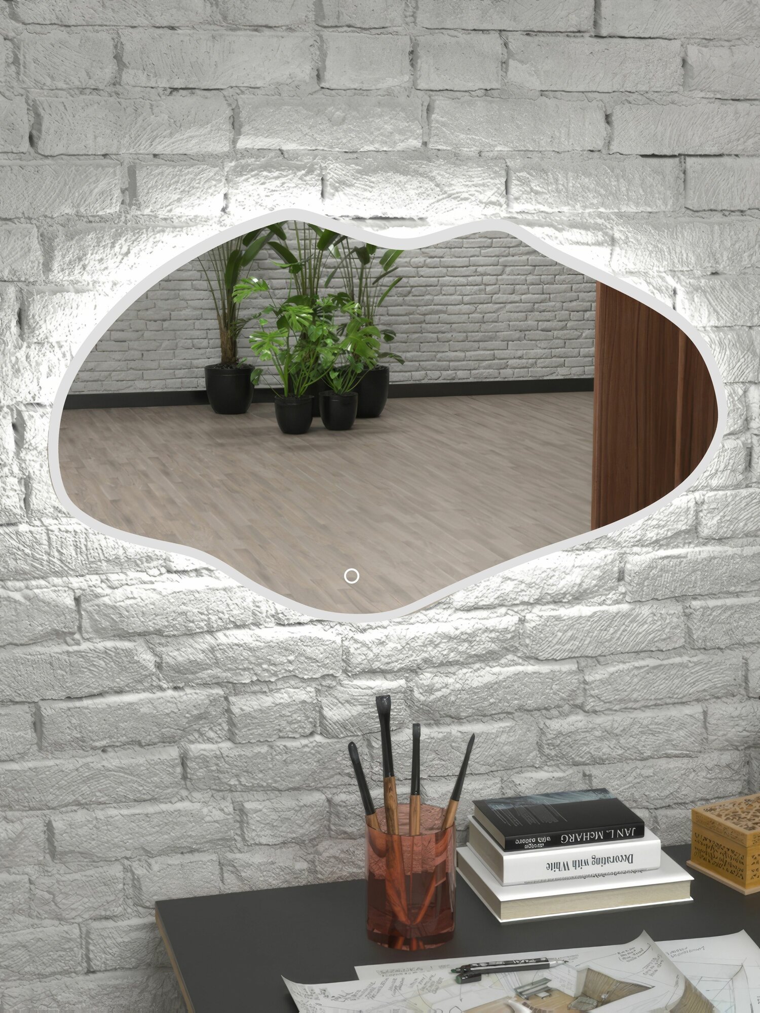 Зеркало настенное неправильной формы в белой окантовке с подсветкой 45х77см холодный свет интересное:
