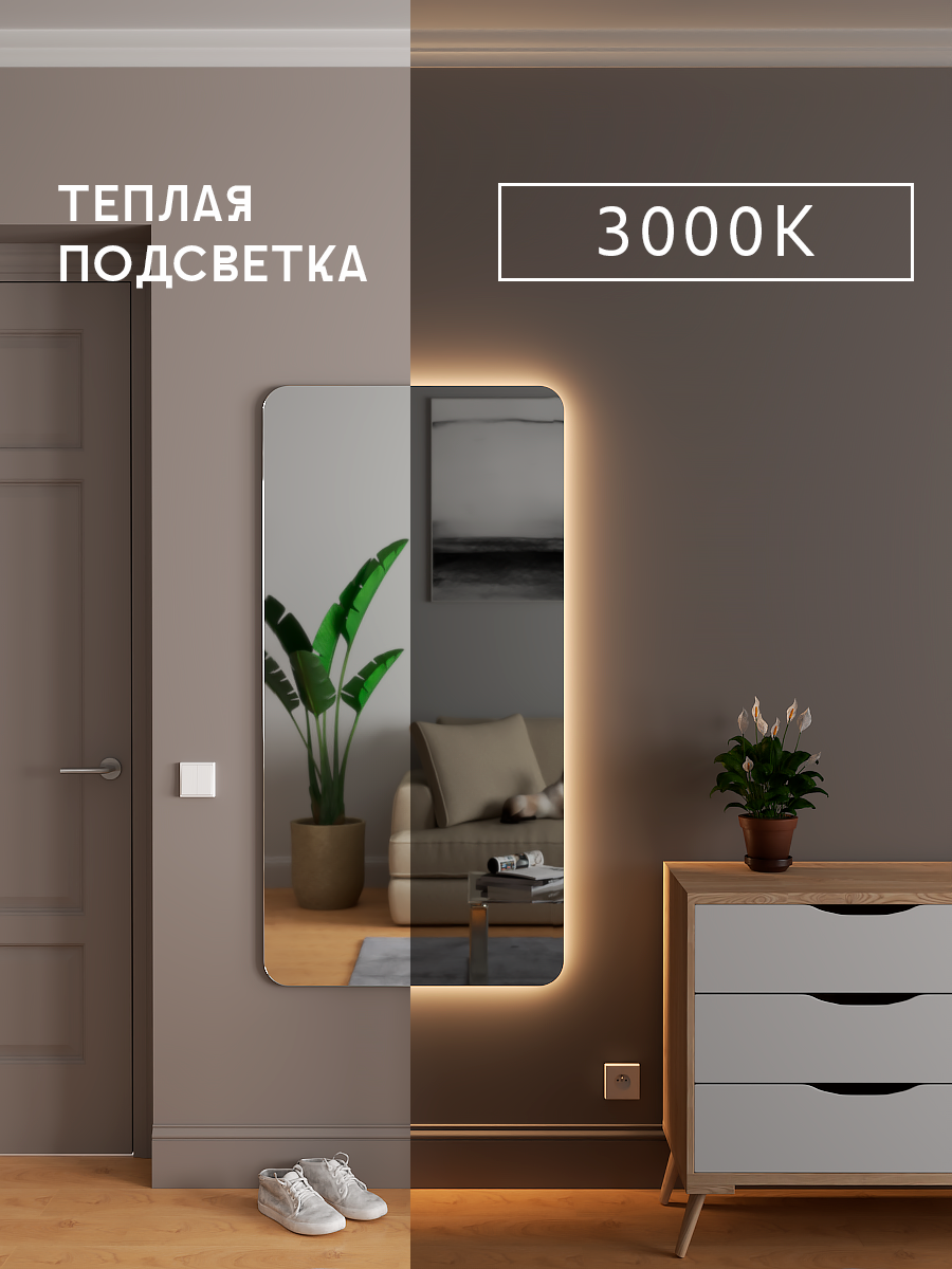 Зеркало без рамы 120х60 см с фоновой подсветкой 3000К теплый белый свет для прихожей, ванной и туалетного столика