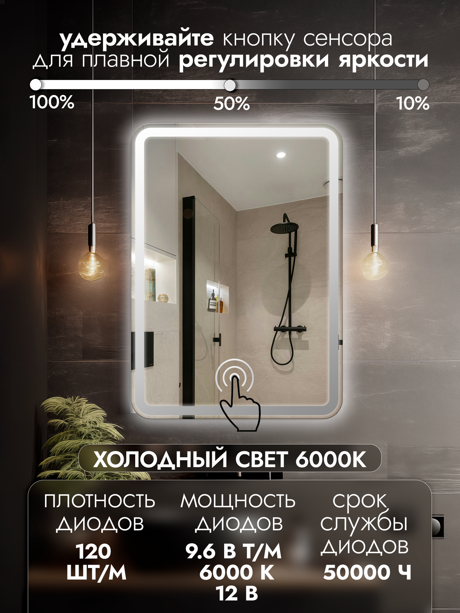 Зеркало настенное для ванной КерамаМане 70*100 см с холодной подсветкой 6000 К с сенсорной кнопкой