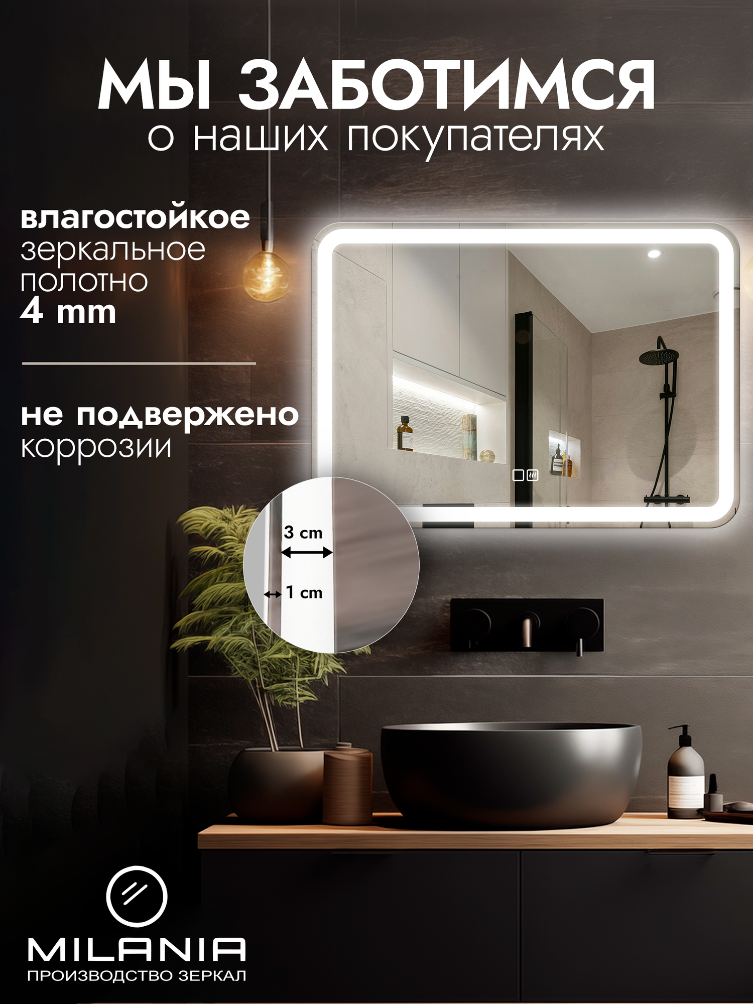 СохранитьНастенное зеркало с подсветкой и подогревом в ванную Laino 80х60 см (ореольная подсветка, холодный свет 6000К, сенсорное управление, прямоугольное зеркало для ванной, функция Антипар) интересное: