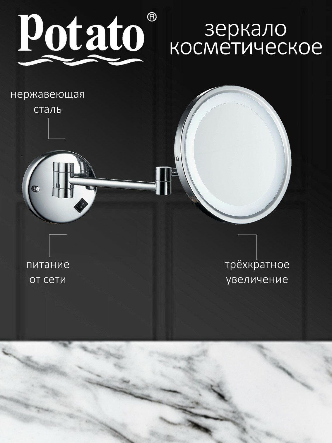Зеркало косметическое Potato P766 с подсветкой круглое, настенное, увеличение 3Х, хром интересное: