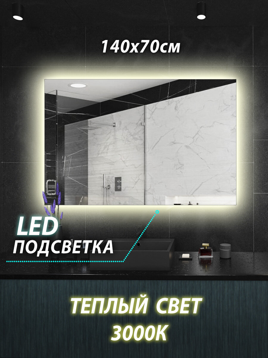 Зеркало настенное для ванной КерамаМане 140*70 см с тёплой подсветкой 3000 К с сенсорной кнопкой