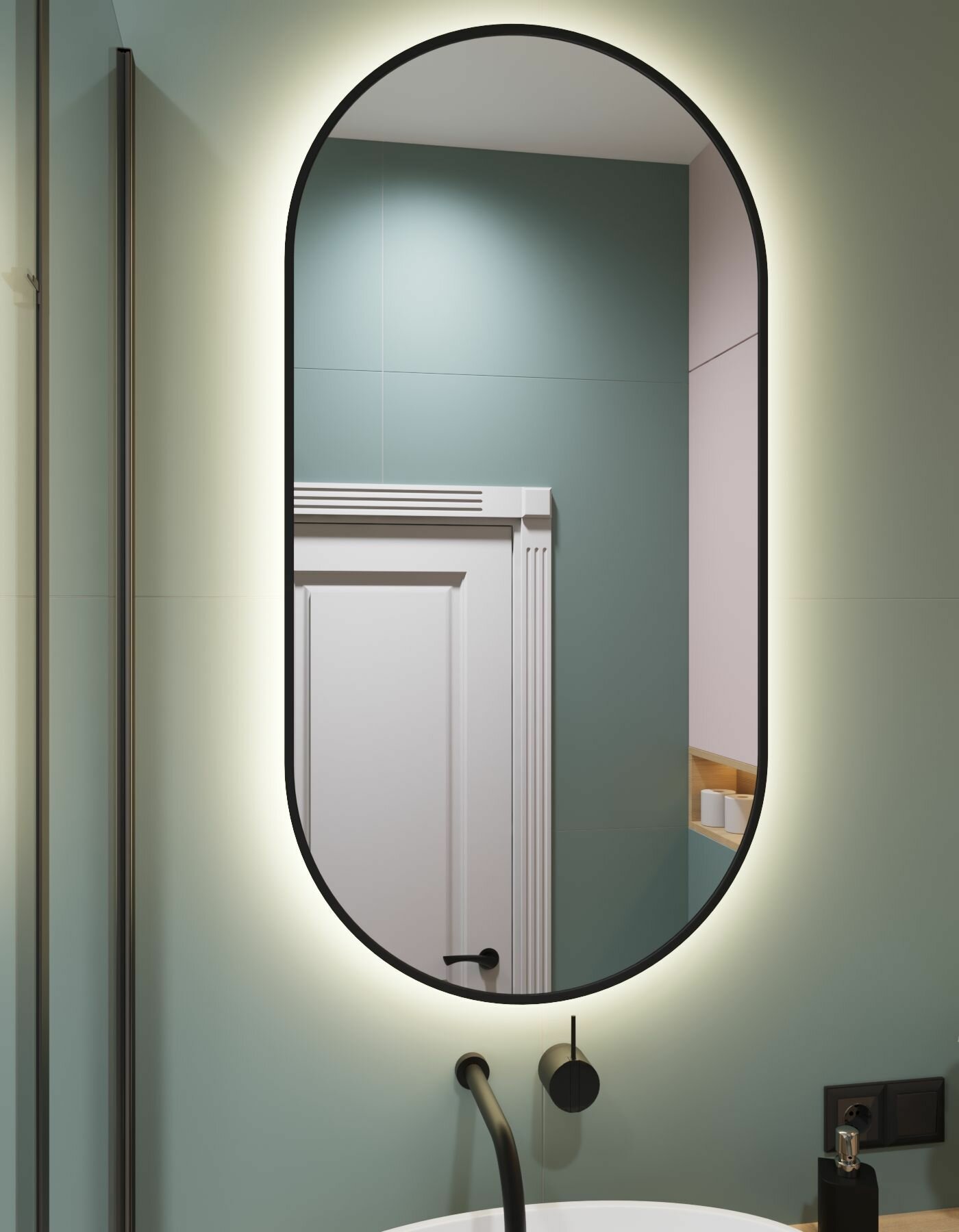 СохранитьОвальное зеркало капсула в тонкой черной раме 101/48 см с нейтральной подсветкой под выключатель интересное: