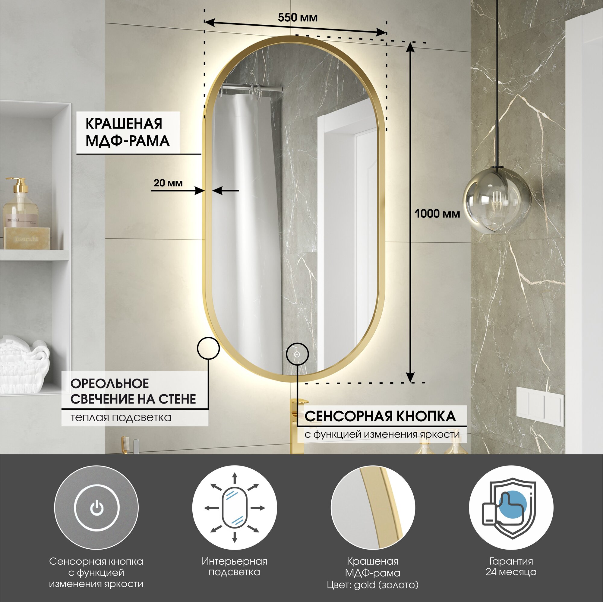 Купить Зеркало в золотой раме 100х55, для ванной с тёплой LED-подсветкой, сенсор с диммером, класс защиты IP44 Max Mirrors