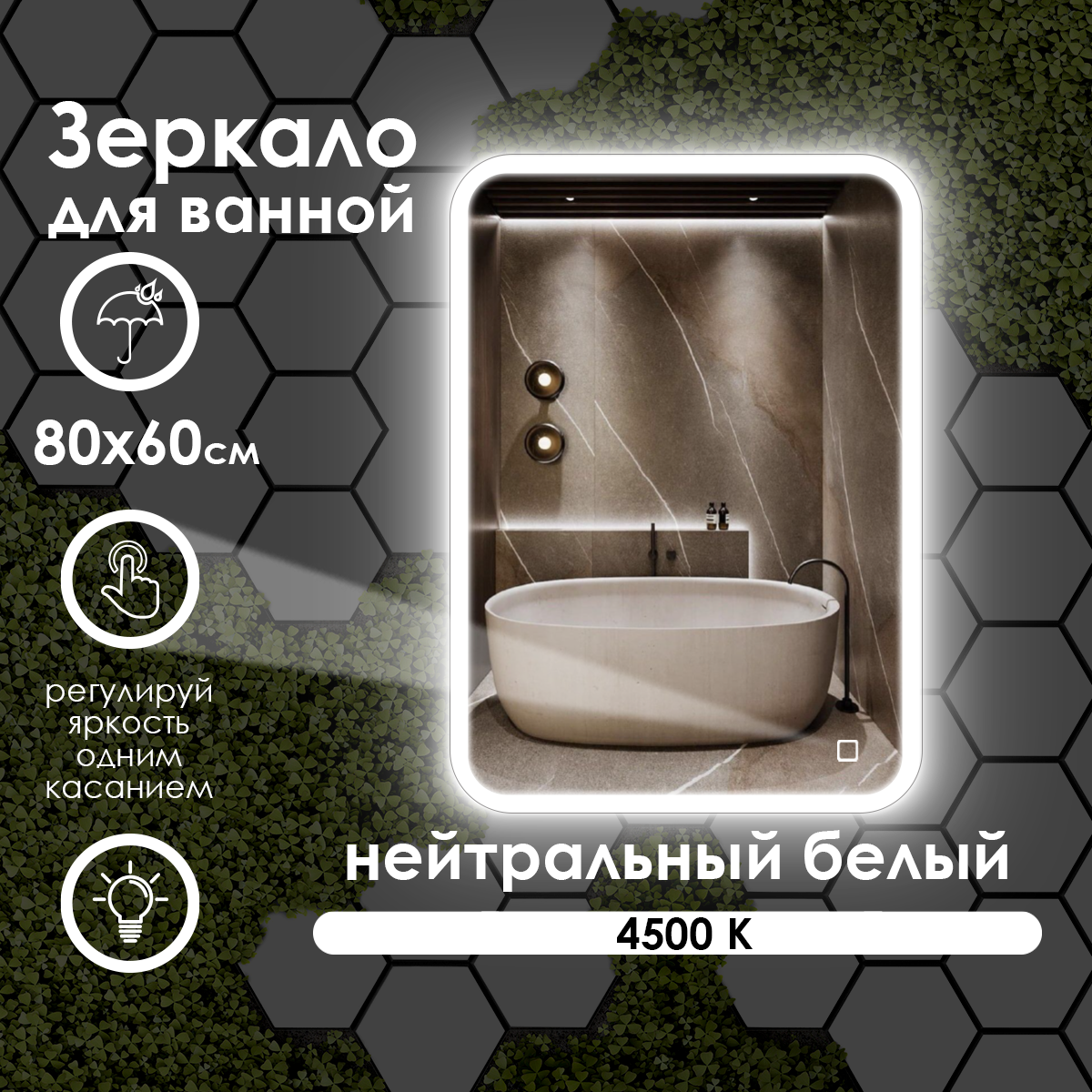 Зеркало настенное для ванной КерамаМане 70*100 см с холодной подсветкой 6000 К с сенсорной кнопкой