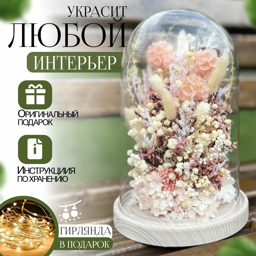 Стабилизированные цветы и сухоцветы в колбе 22 см. "Розовая мечта"