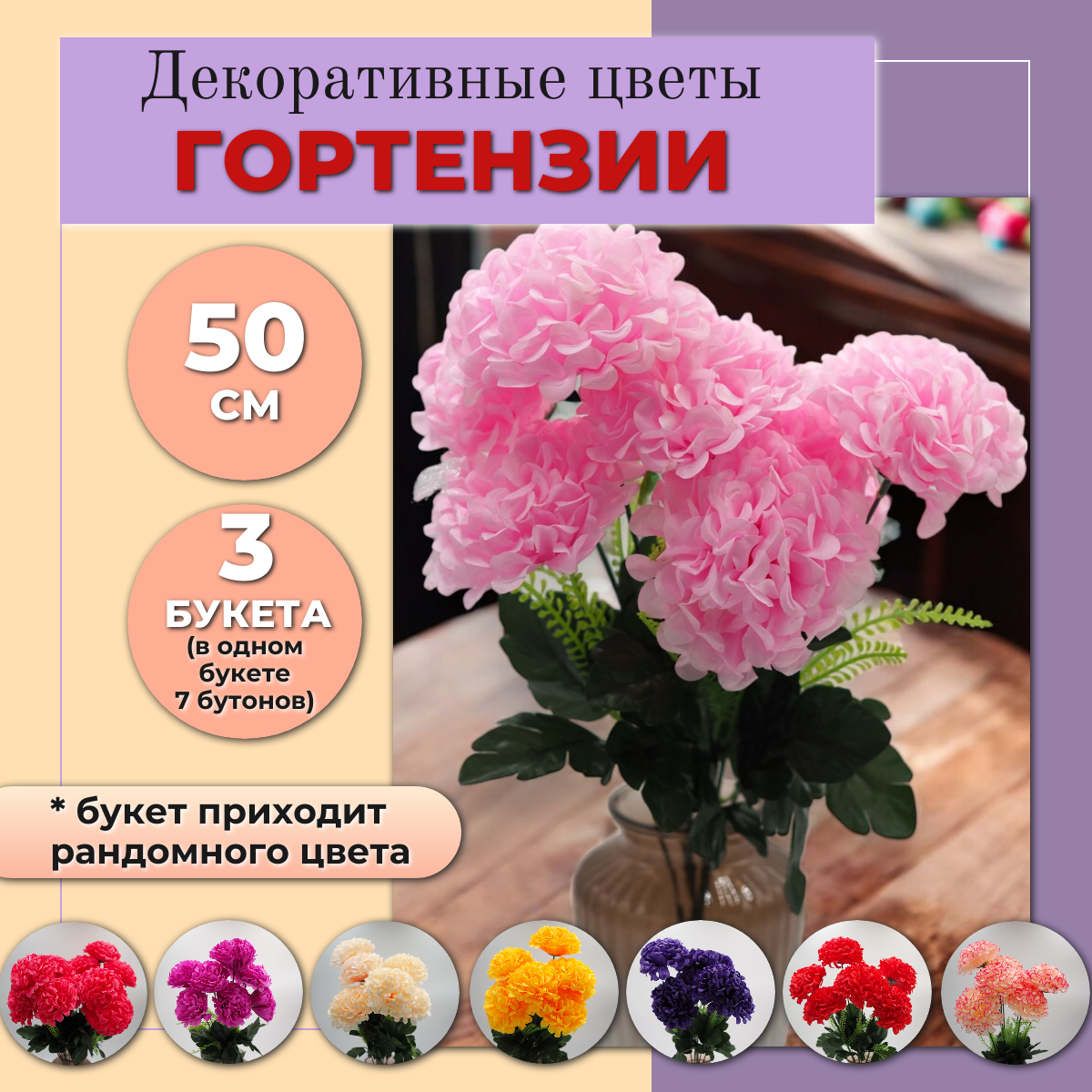 Цветы Гортензии (CV16) декоративные, искусственные, интерьерные 3 букета, 50см, микс интересное: