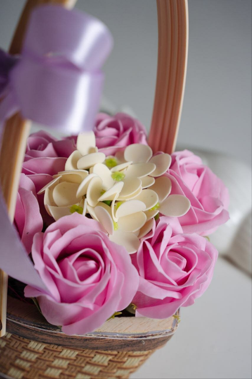Купить Букет декоративных розовых цветов в корзине