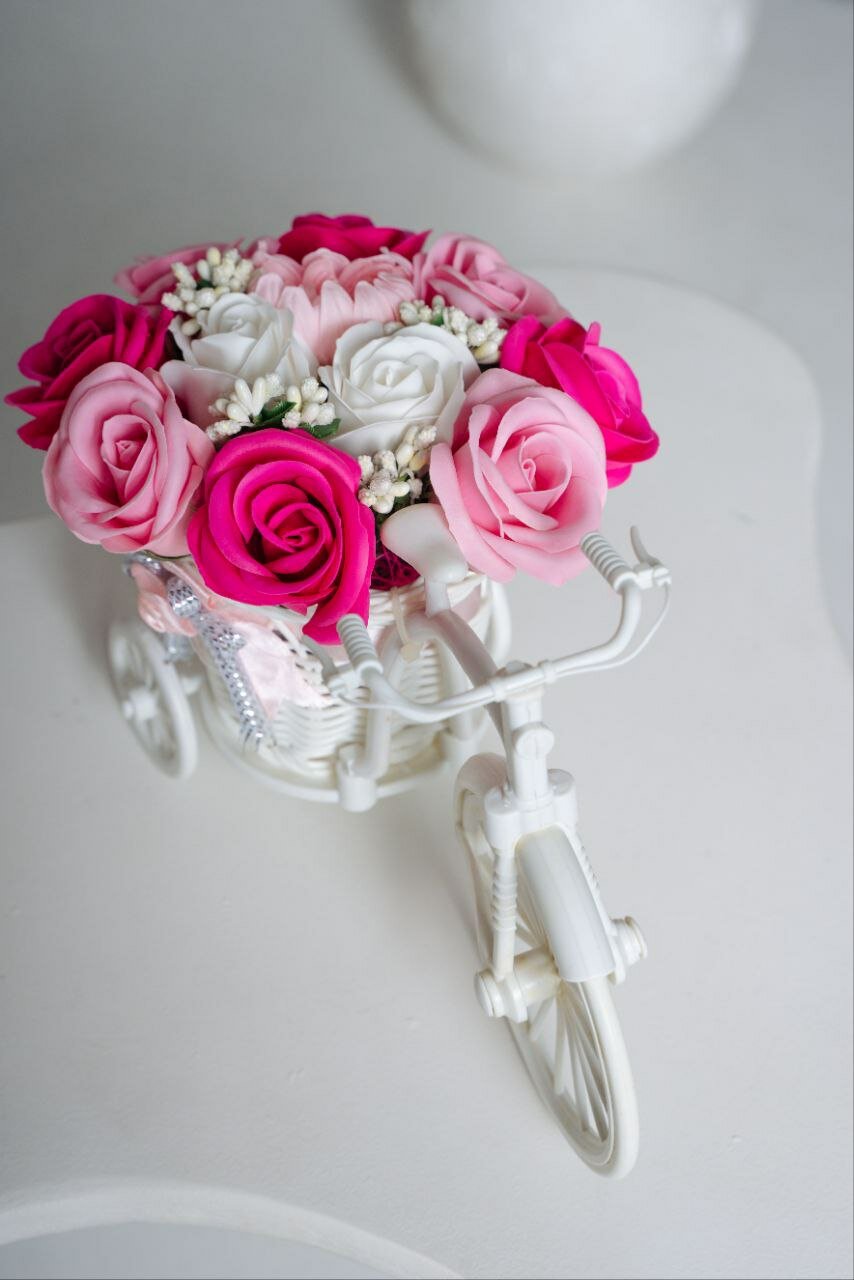 Букет декоративных цветов в велосипеде. Цвет розовый, малое колесо интересное: