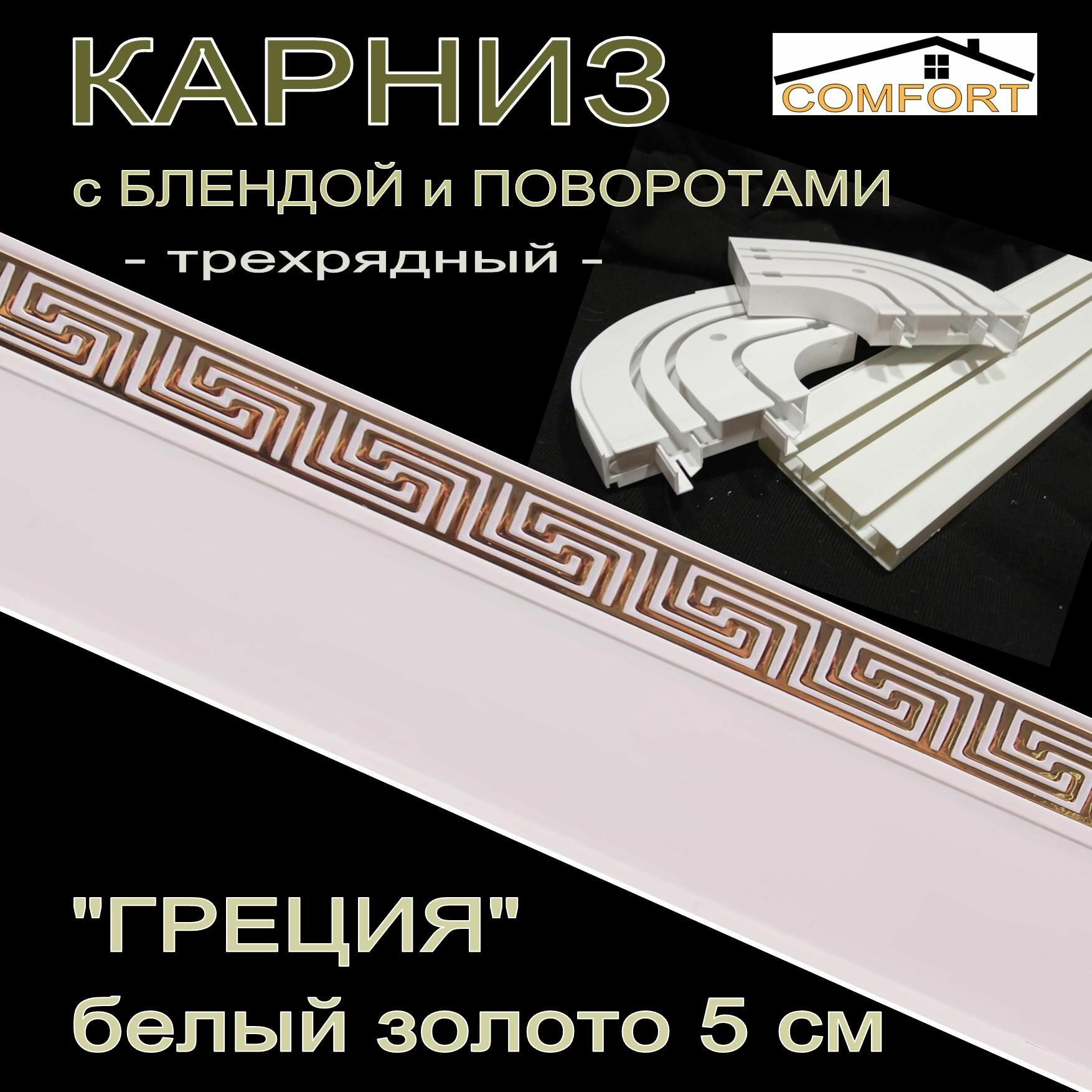 Купить Багетный карниз ПВХ с поворотами, 3-х рядный, 240 см, "Греция", белый глянец с золотом 5 см