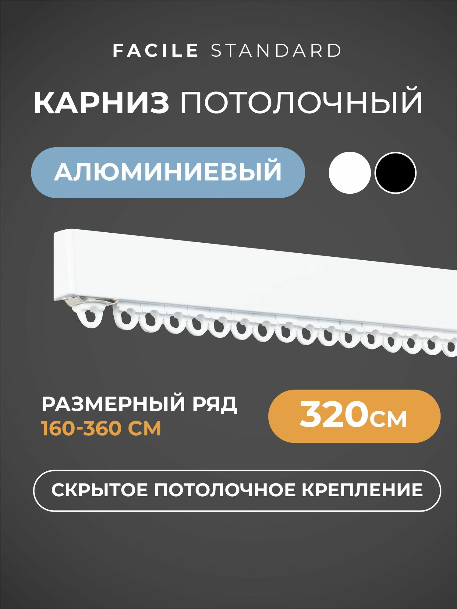Карниз для штор однорядный потолочный профильный металлический Facile standard 320 см черный