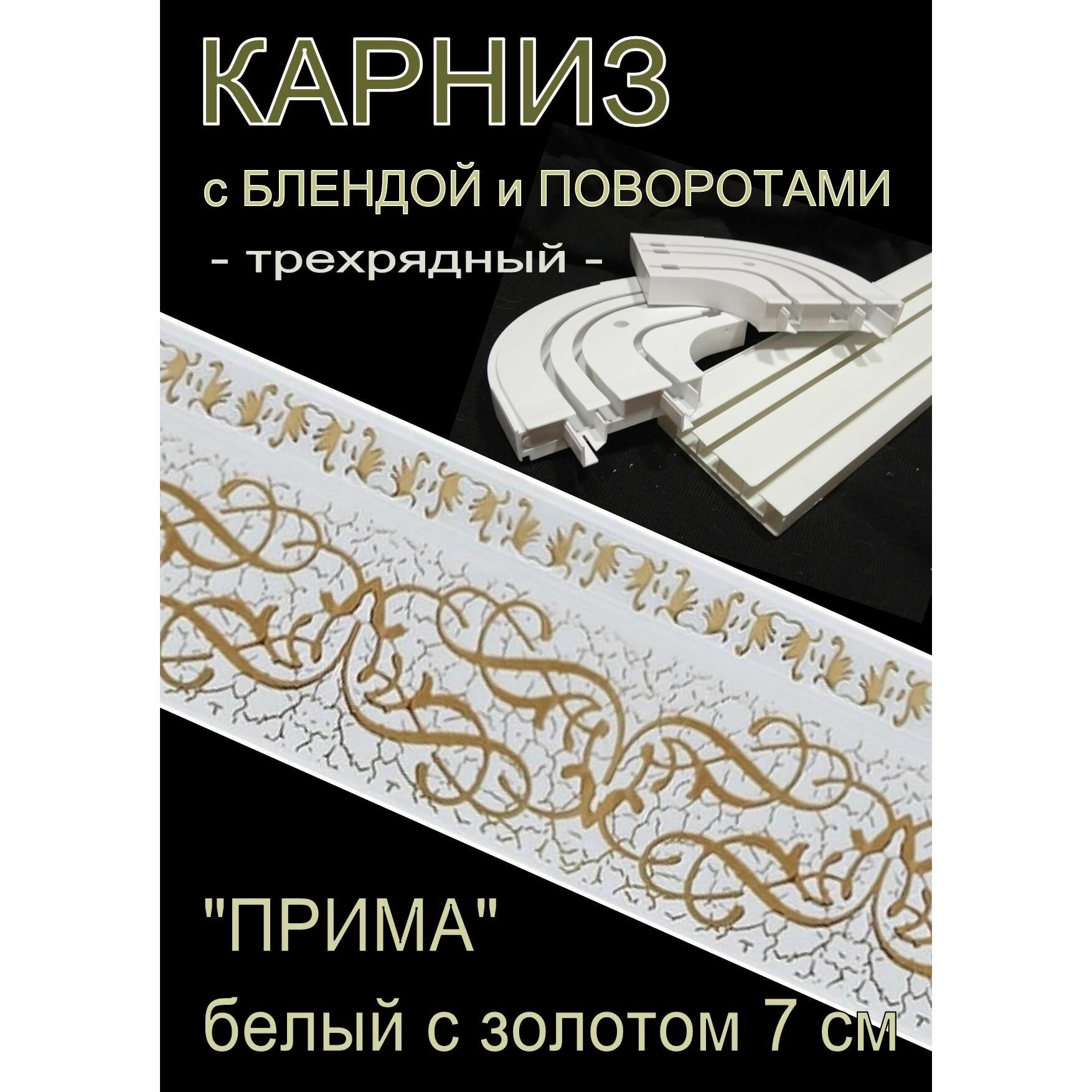 Купить Багетный карниз ПВХ с поворотами, 3-х рядный, 260 см, "Прима", белый золото 7 см