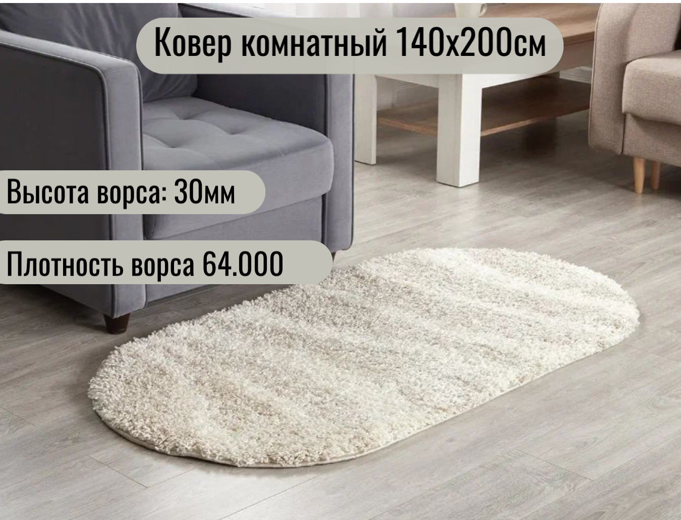 Ковер овальный 0.8х1,5м CARPET_MANIA 42106, с длинным ворсом 30мм, бежевый