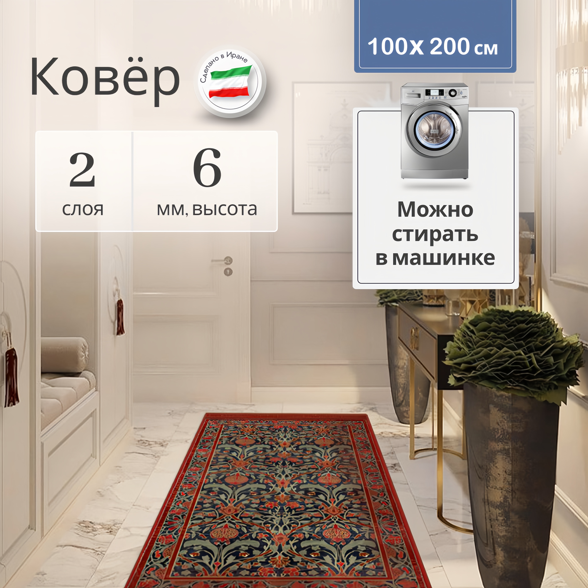 Купить Иранский ковер винтажный на пол для комнаты безворсовый 100 х 200 см, палас для кухни, в гостиную