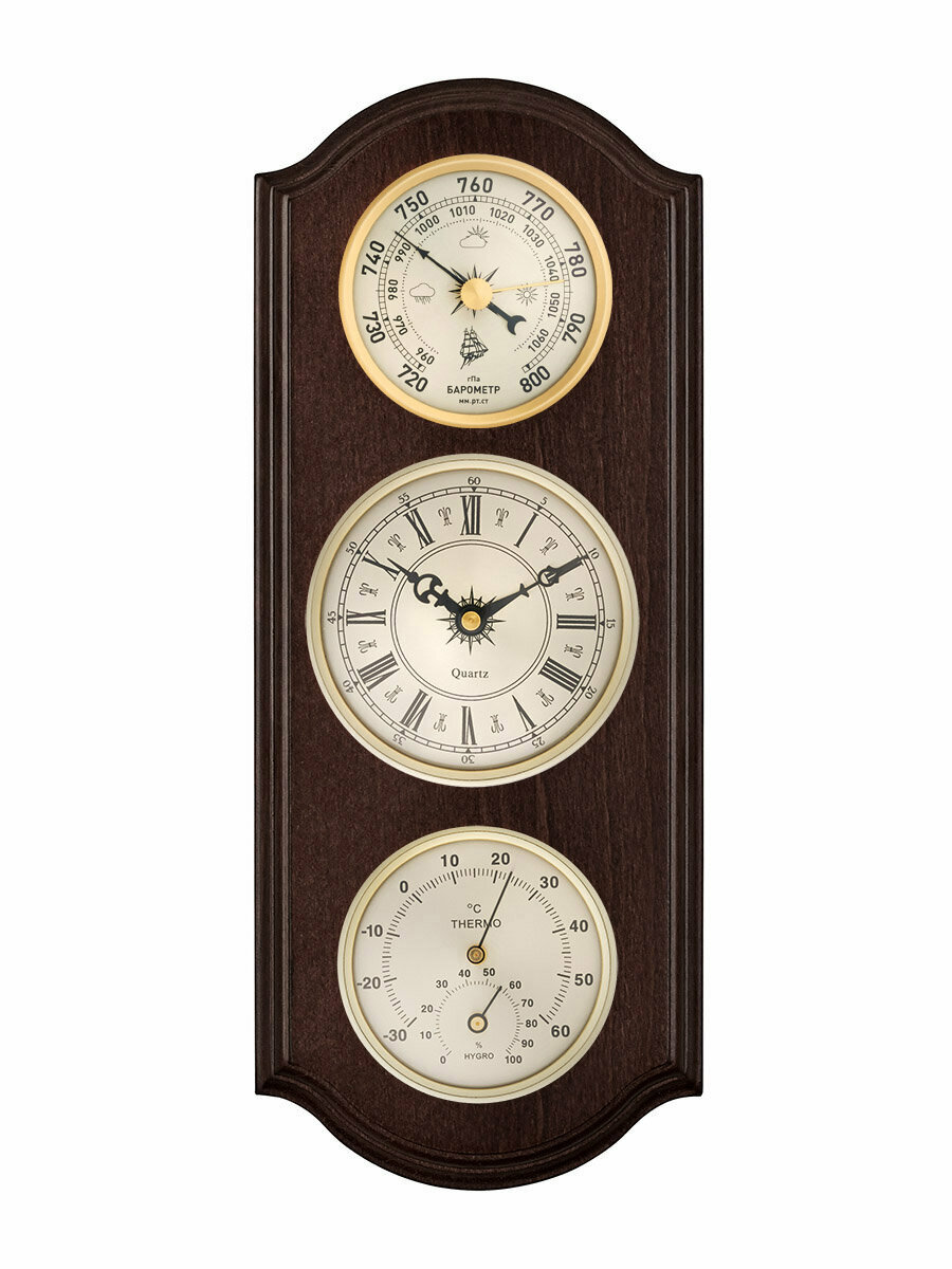 Метеостанция Бриг КМ93005-ЧБ(ТГ)-В, настенные часы в дереве, барометр, термометр, гигрометр, настенное крепление. интересное: