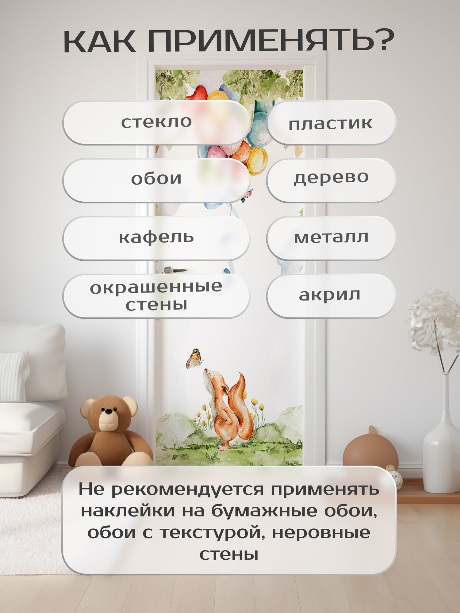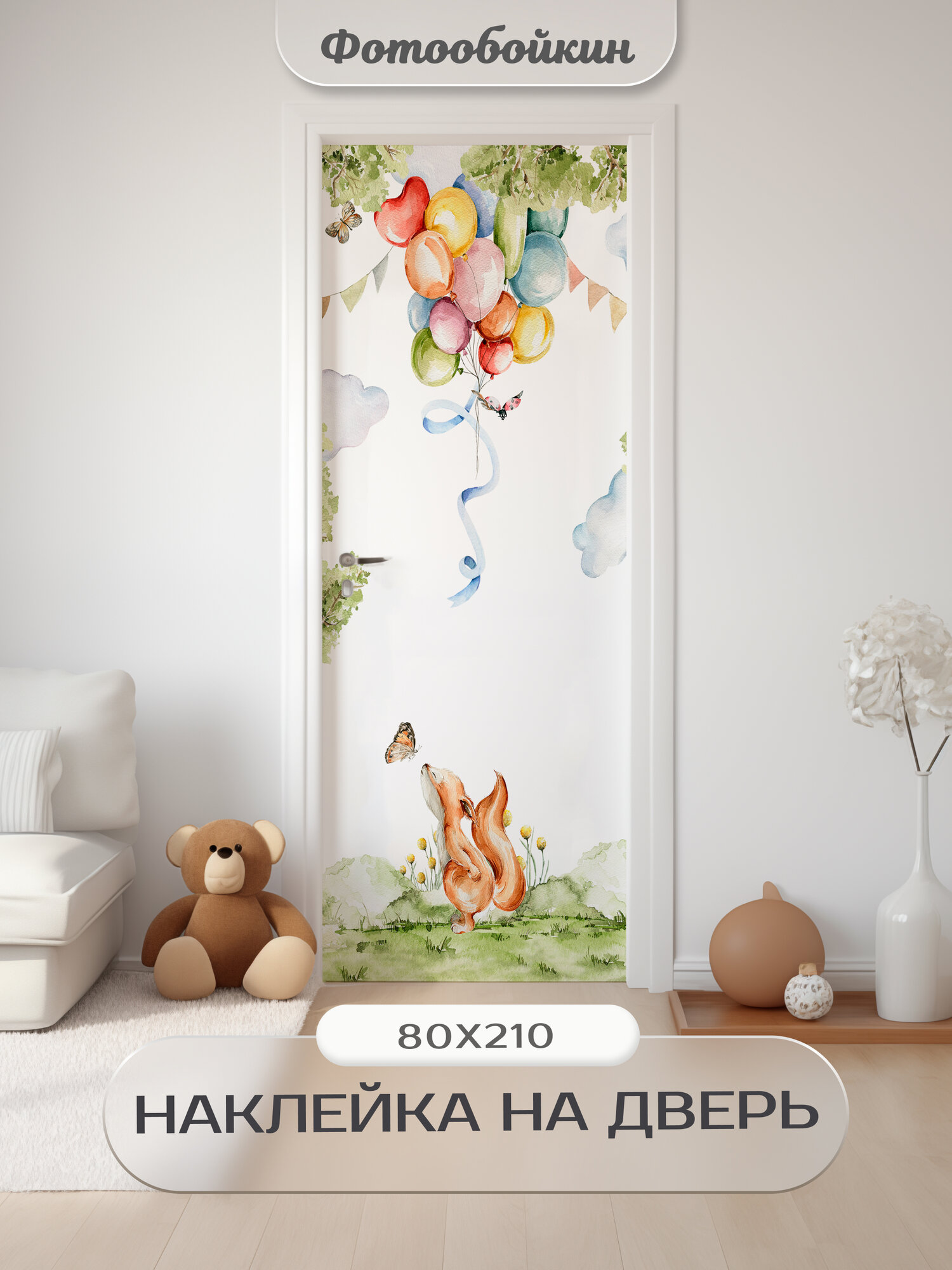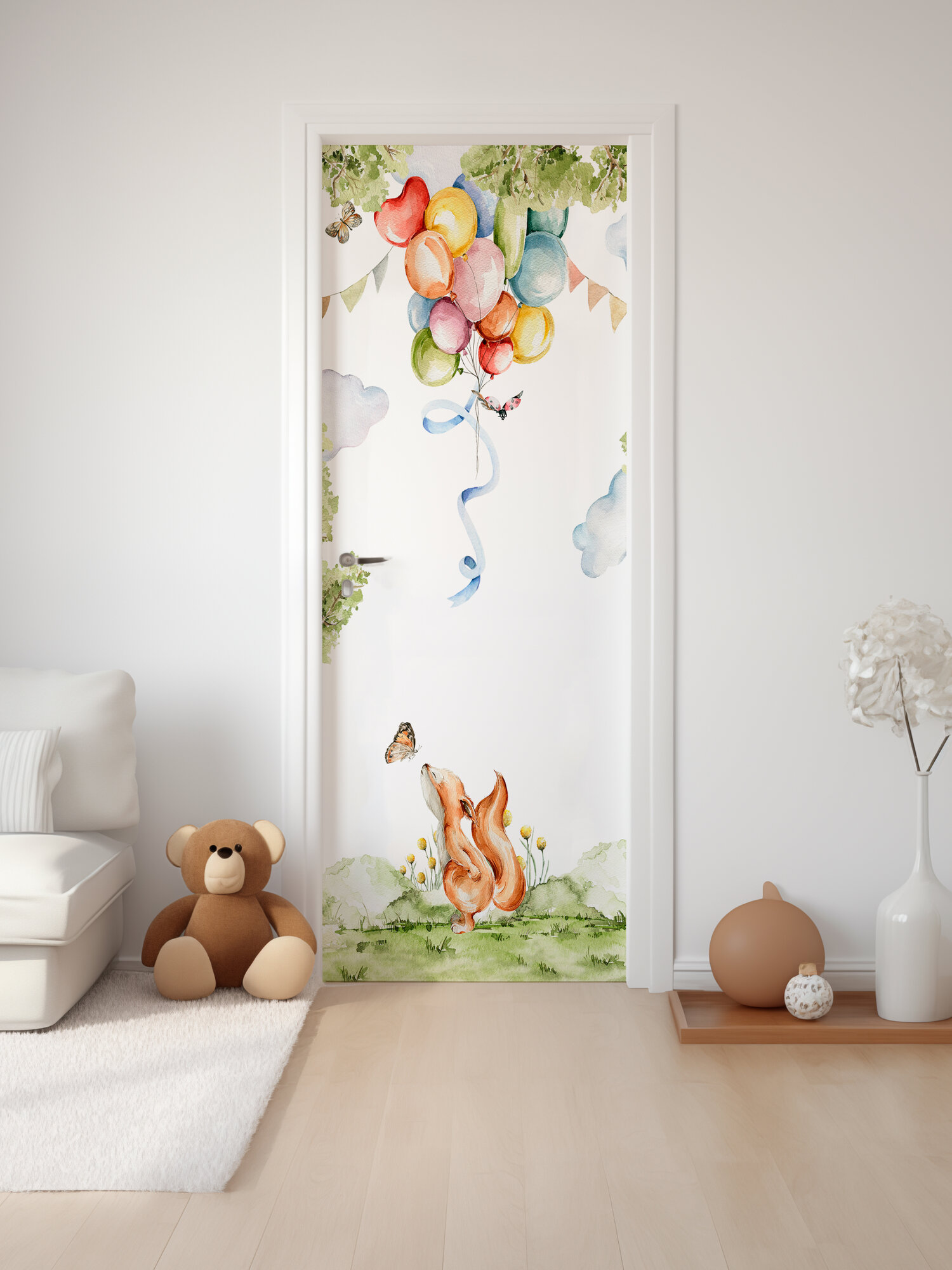 Купить Плотная виниловая самоклеящаяся интерьерная наклейка на дверь "Лисичка и шары" 80х210 см, самоклейка на шкаф, мебель