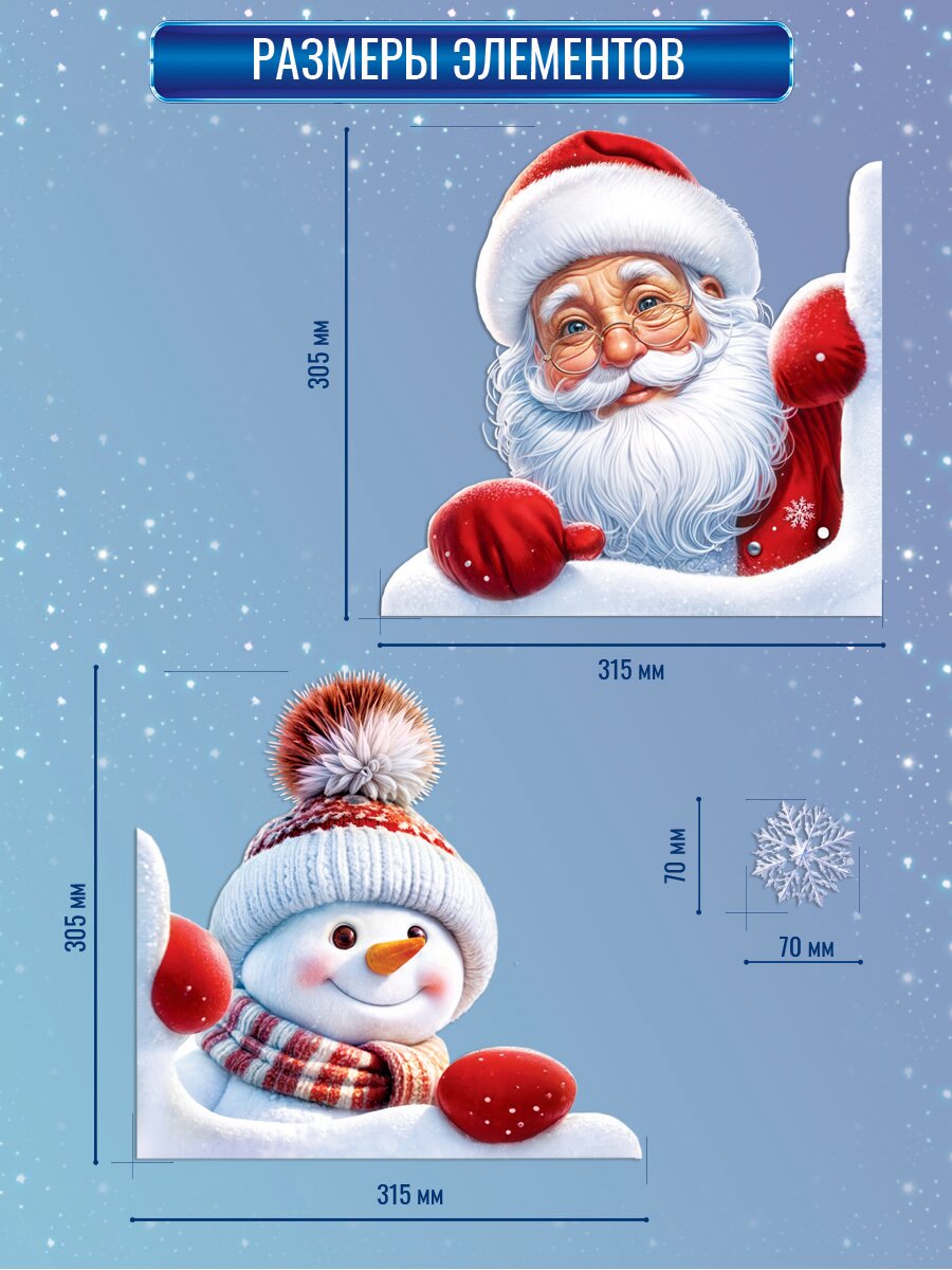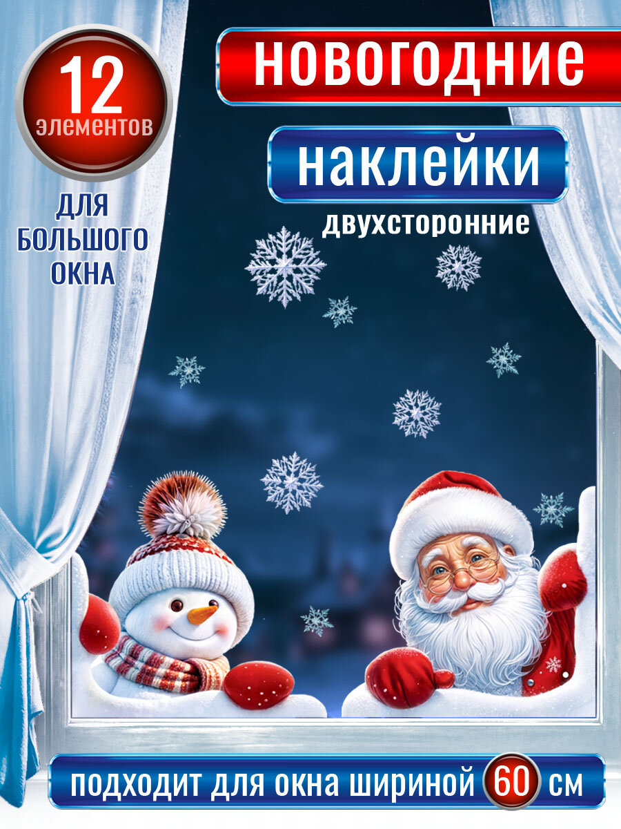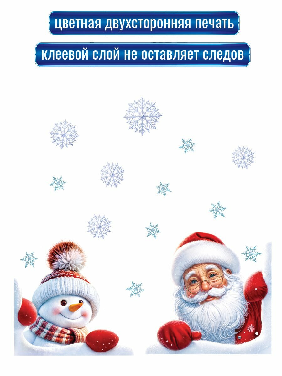 Новогодние наклейки с двухсторонней цветной печатью на окна "Дед Мороз и снеговик в окне" интересное:
