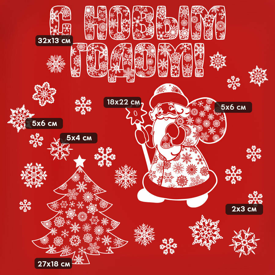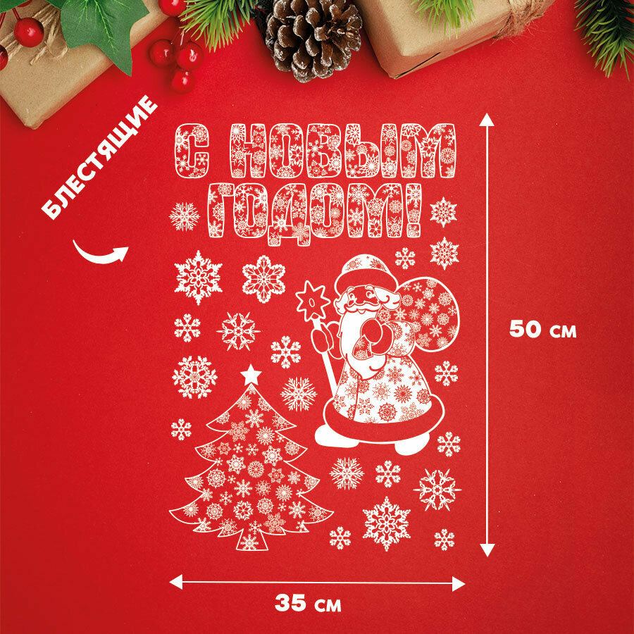 Купить Новогодние наклейки на стену и окна для декора и украшения / Дед мороз, елка, снежинки / 50х35 см