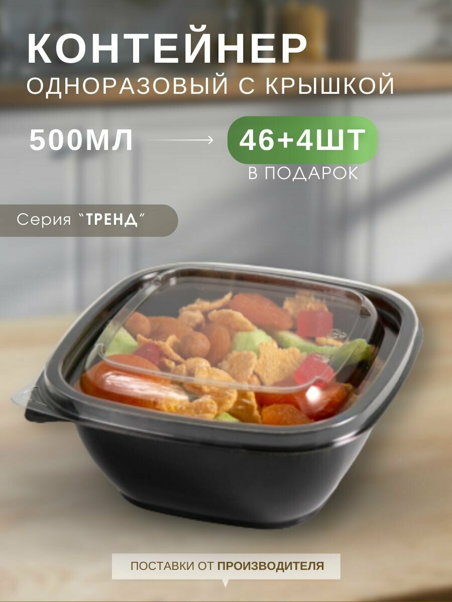 Купить Контейнеры одноразовые пластиковые Каштан Тренд черные с прозрачной крышкой 500 мл, набор контейнеров 46 шт ( + 4 шт в подарок)