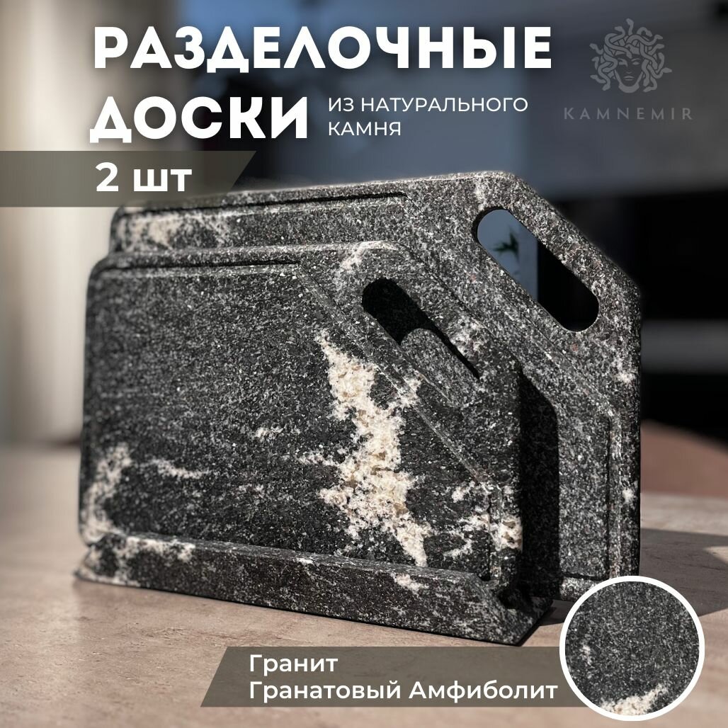 Купить Набор разделочных досок на подставке из Натурального Гранатового амфиболита / каменные доски 2 шт и подставка KAMNEMIR