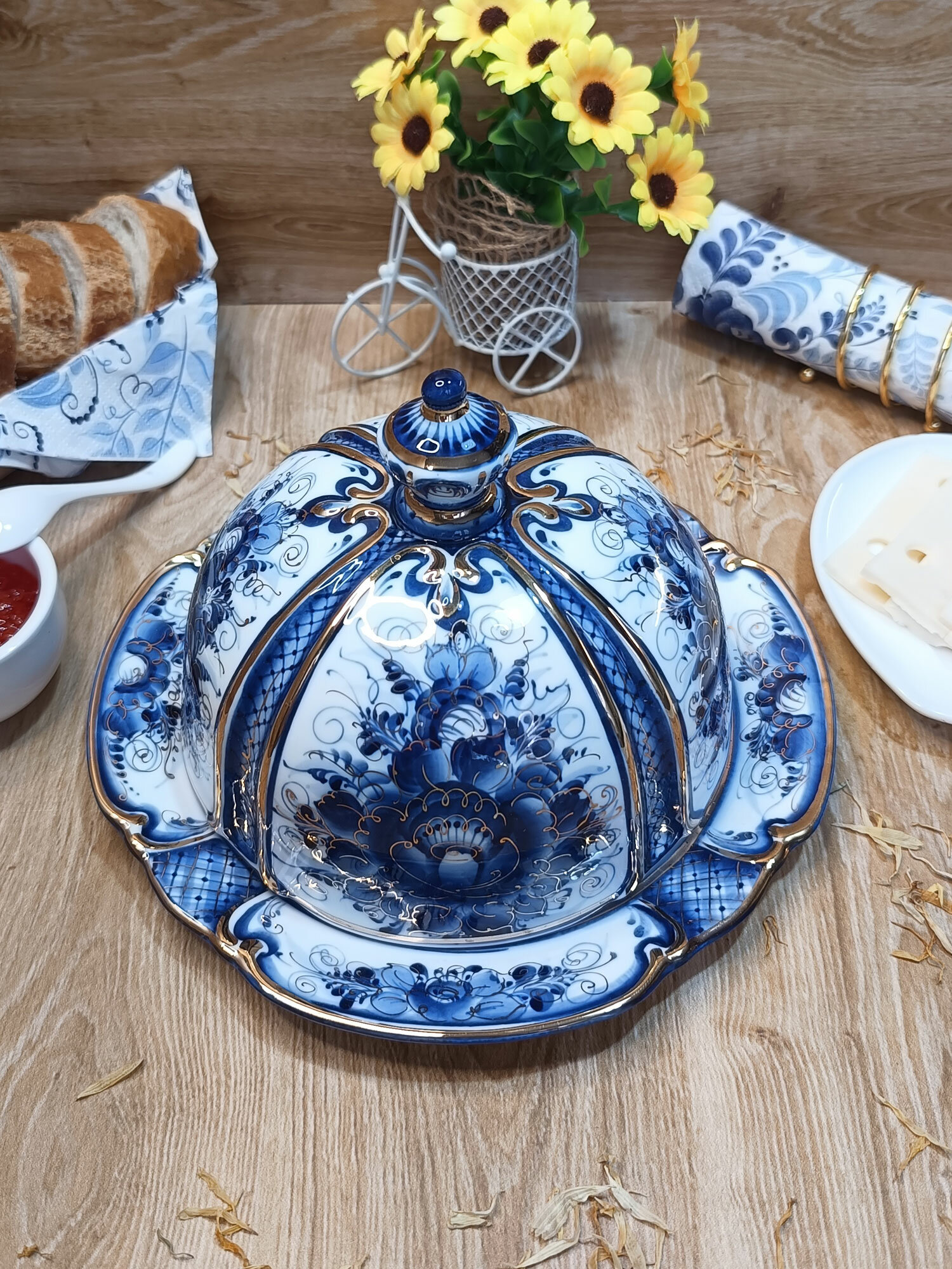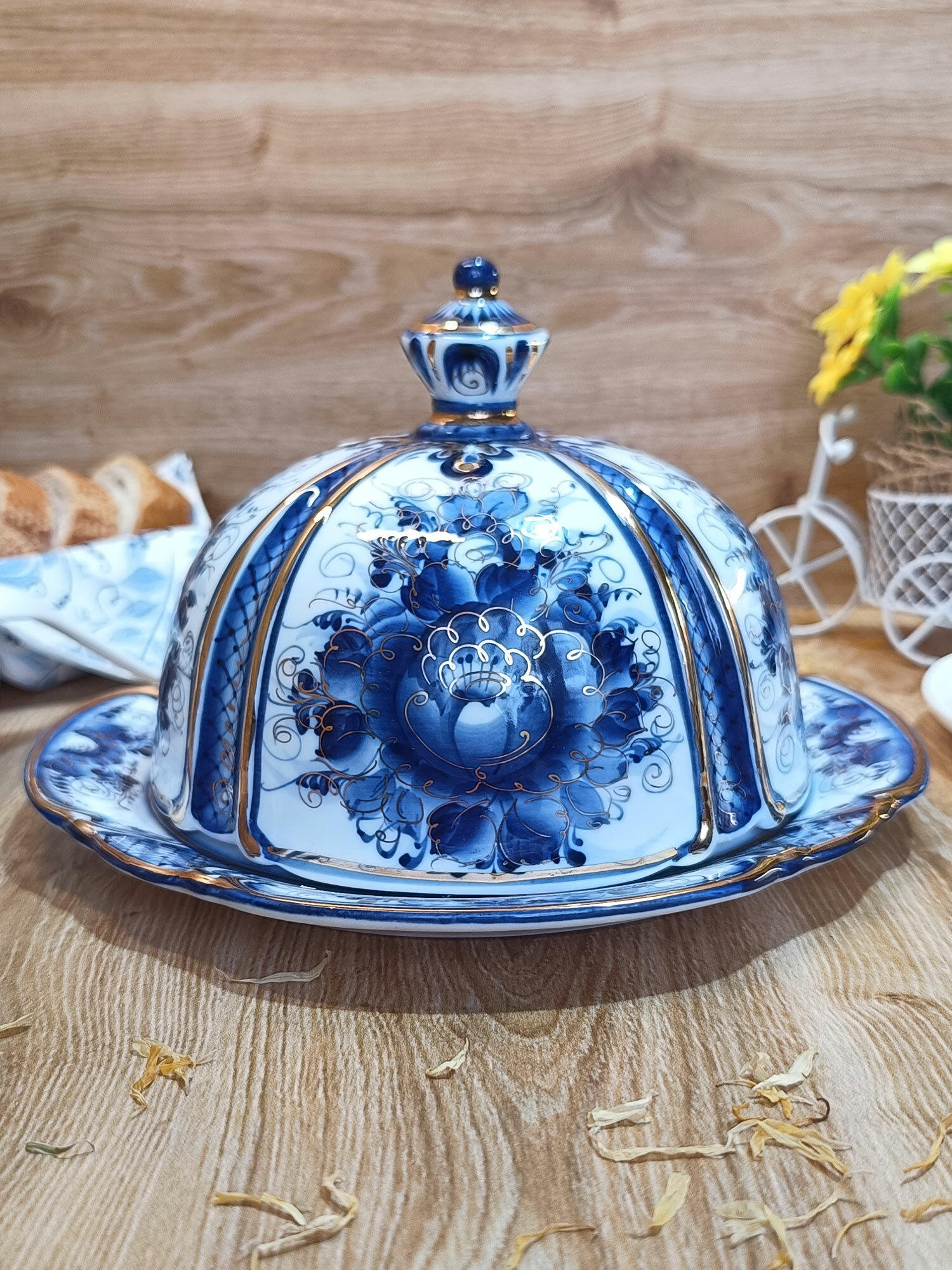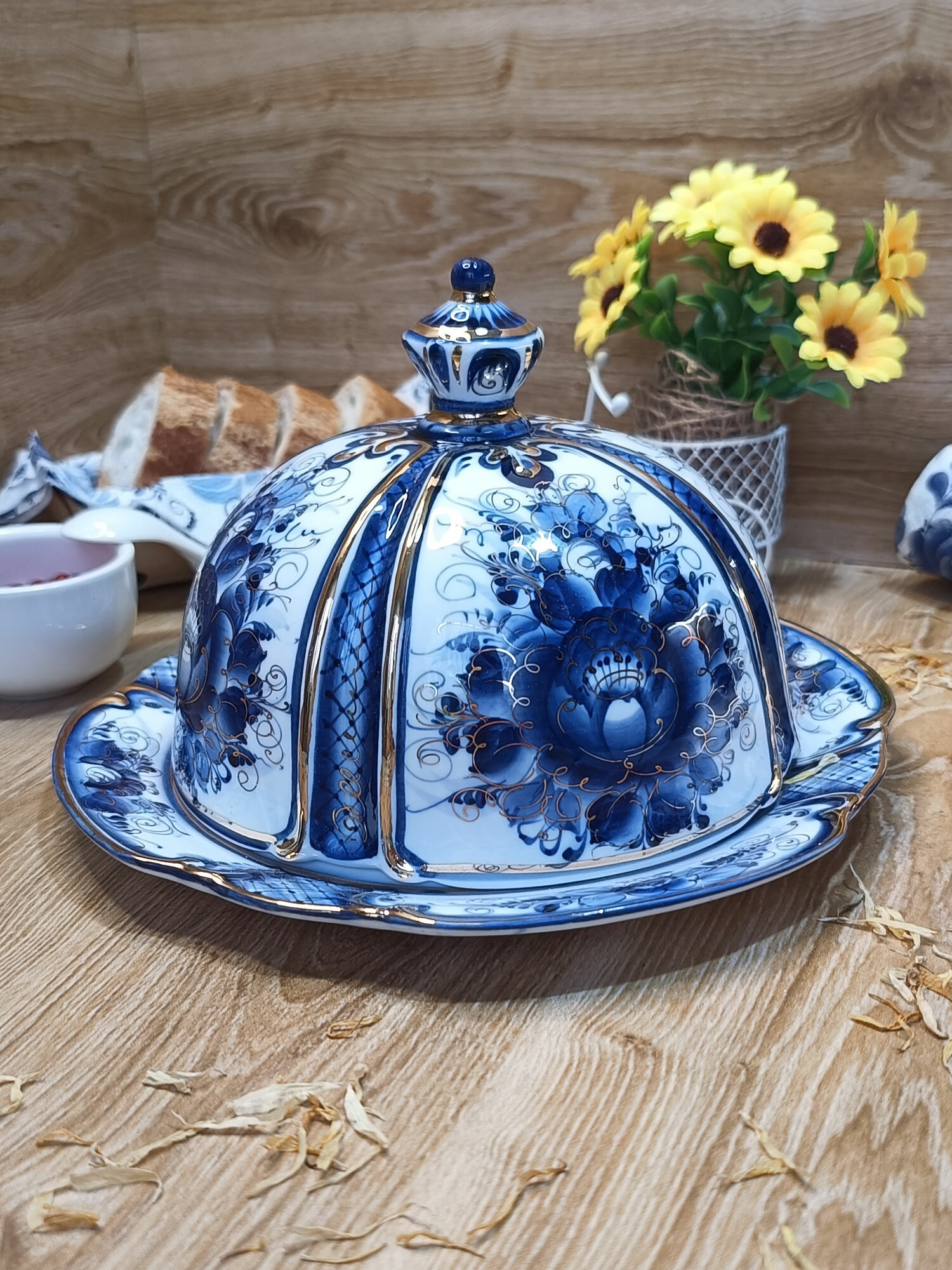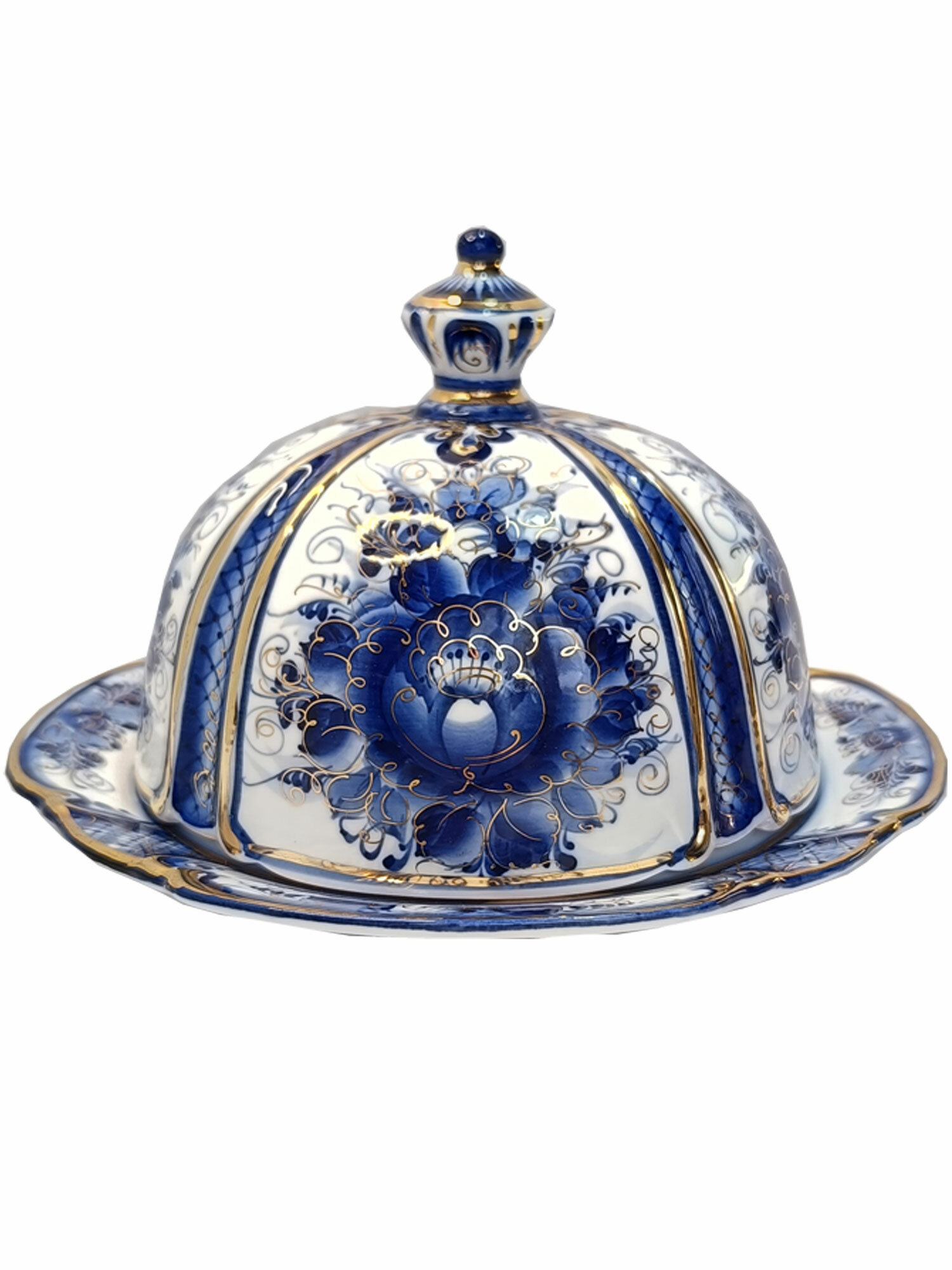 Масленка в золоте Гжель "Сказка", (гжельский фарфор, авторская роспись), диаметр 20 см. интересное: