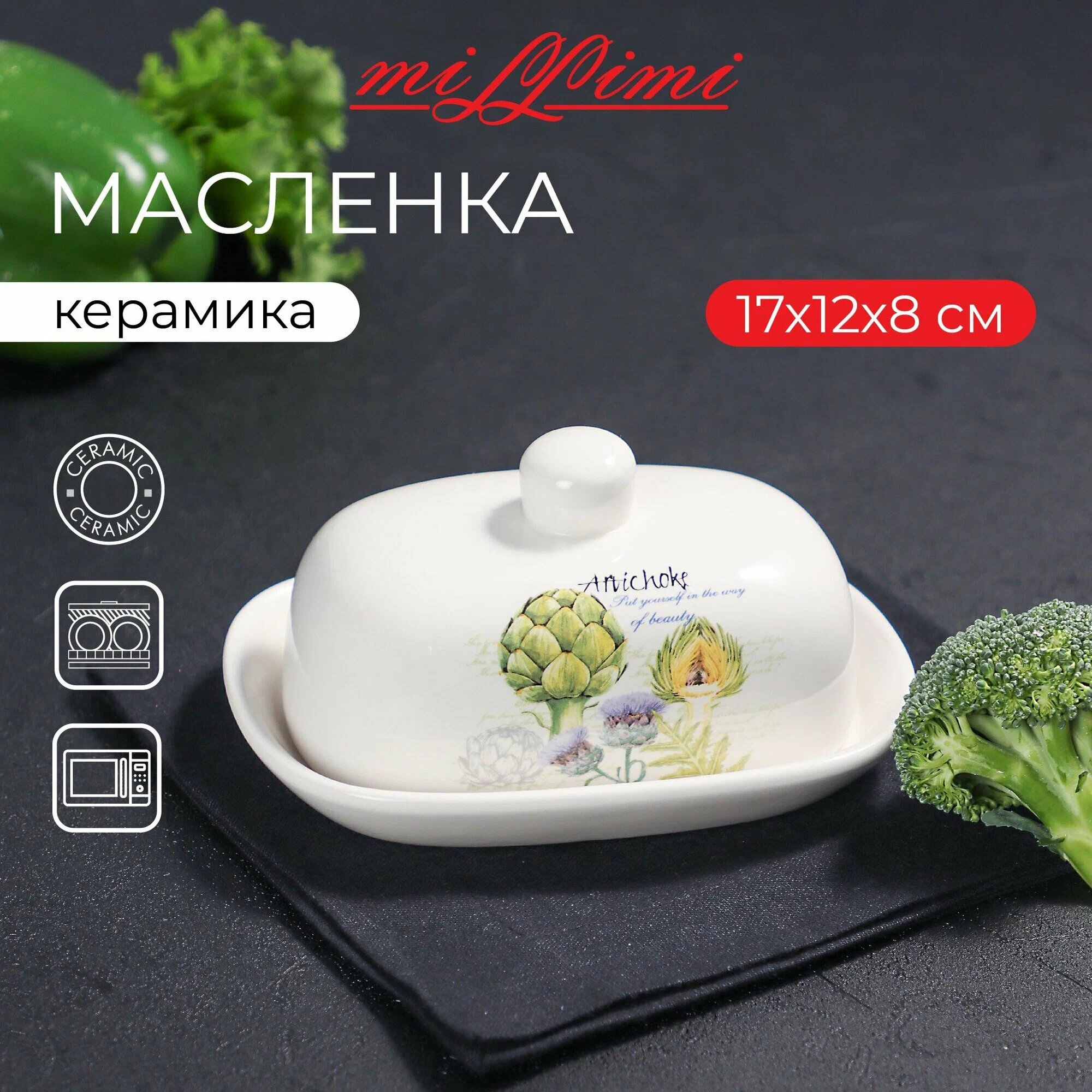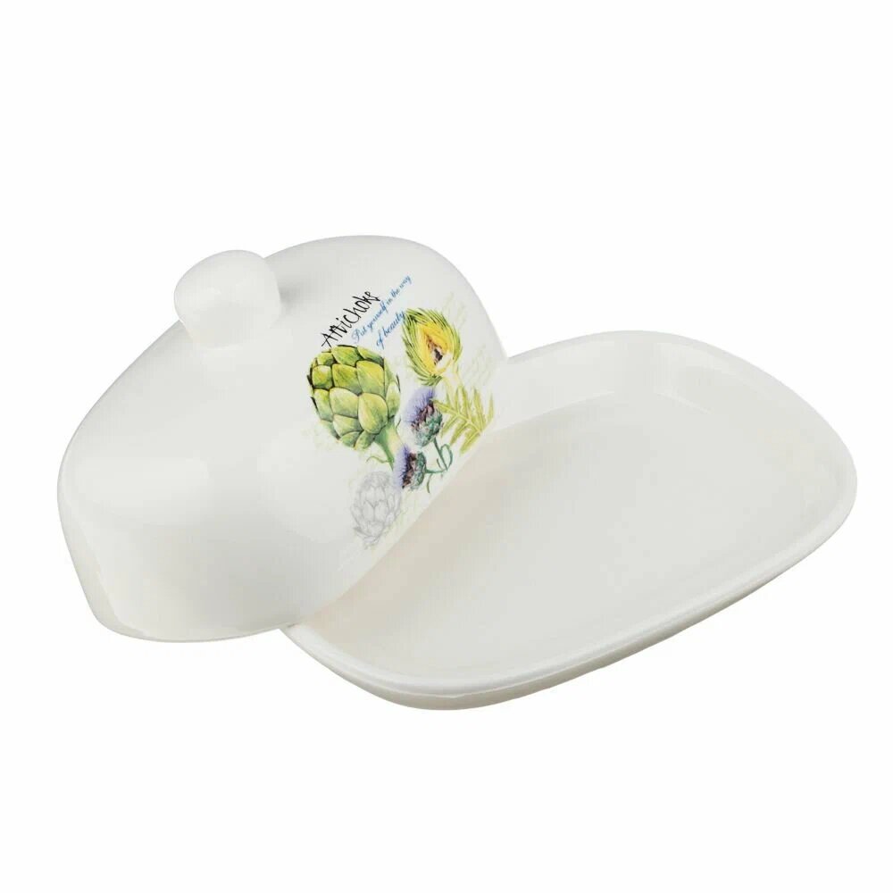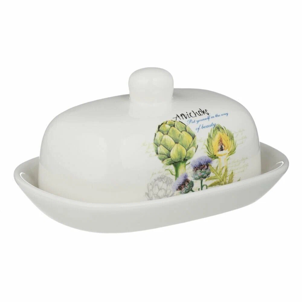 Купить Масленка керамическая MILLIMI Артишоки,17х12x8см, белая, с крышкой