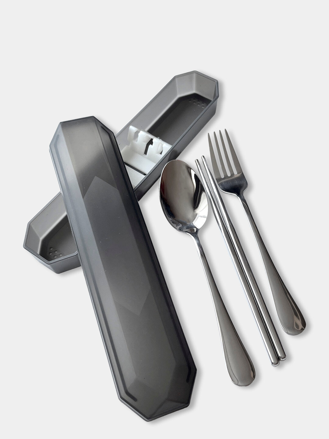 Дорожный набор столовых приборов в футляре - 3 предмета, качественный (ложка, вилка, китайские палочки), прозрачный