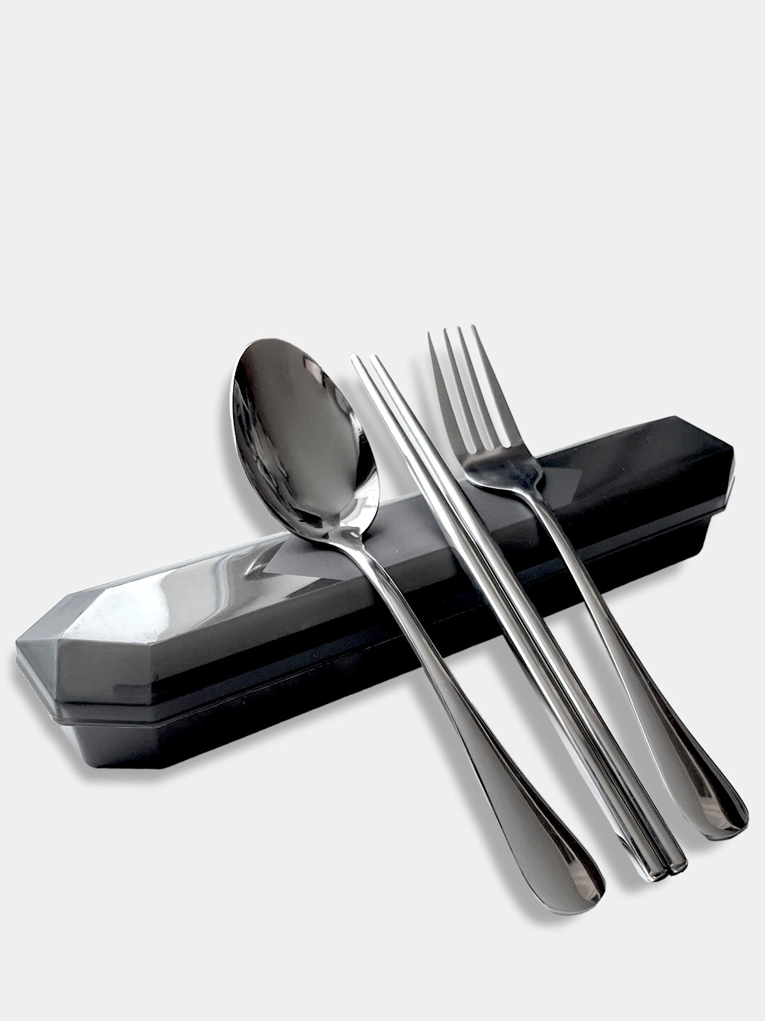 Дорожный набор столовых приборов в футляре - 3 предмета, качественный (ложка, вилка, китайские палочки), прозрачный черный