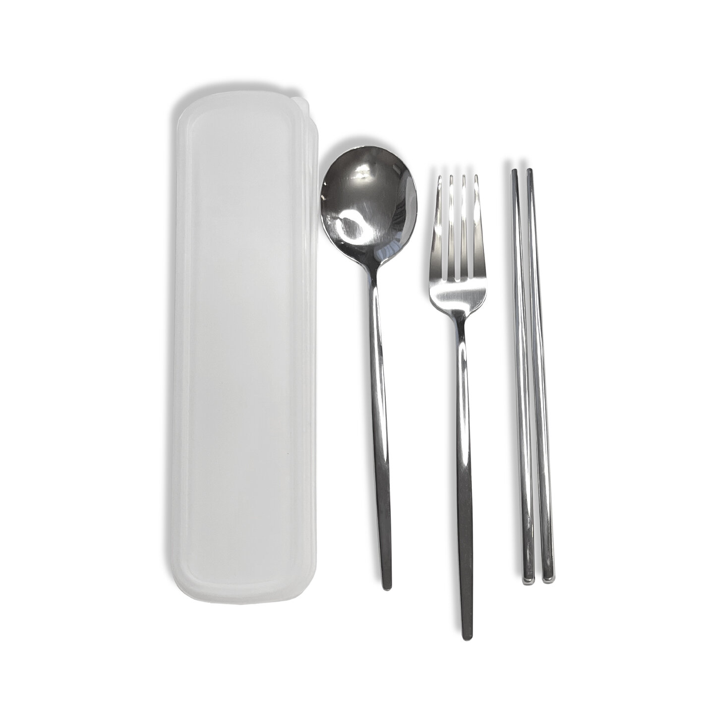 Дорожный набор полноразмерных столовых приборов из 3 предметов (вилка, овальная ложка , китайские палочки), качественный походный набор в футляре, белый матовый