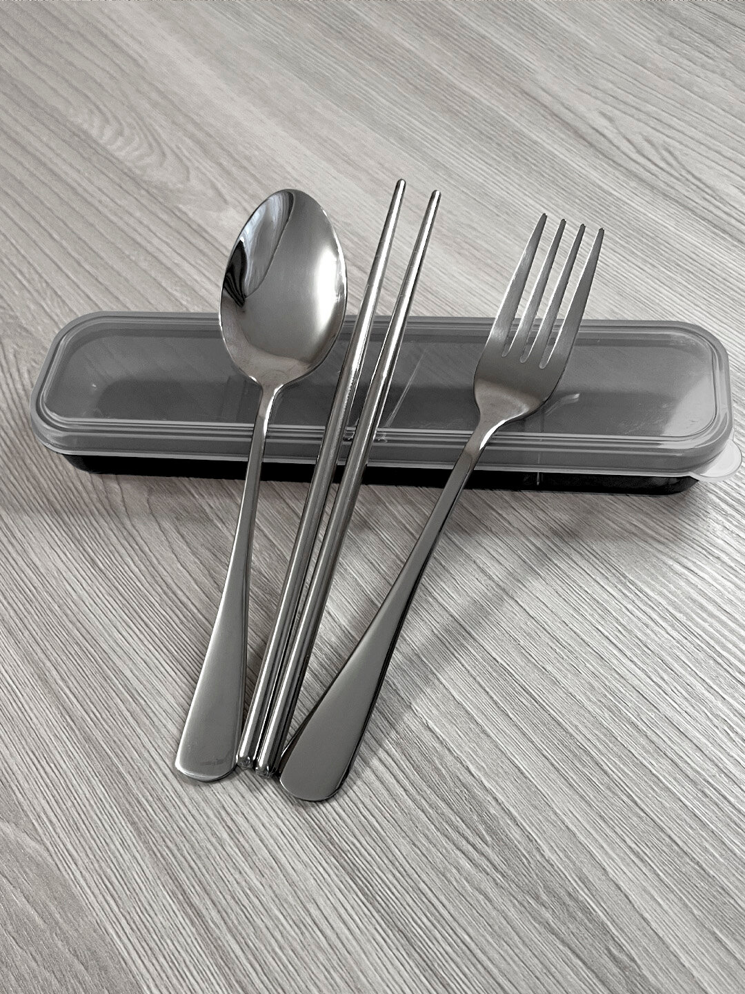 Набор качественных столовых приборов, дорожный - 3 предмета в футляре (вилка, ложка , китайские палочки из нержавеющей стали), черный