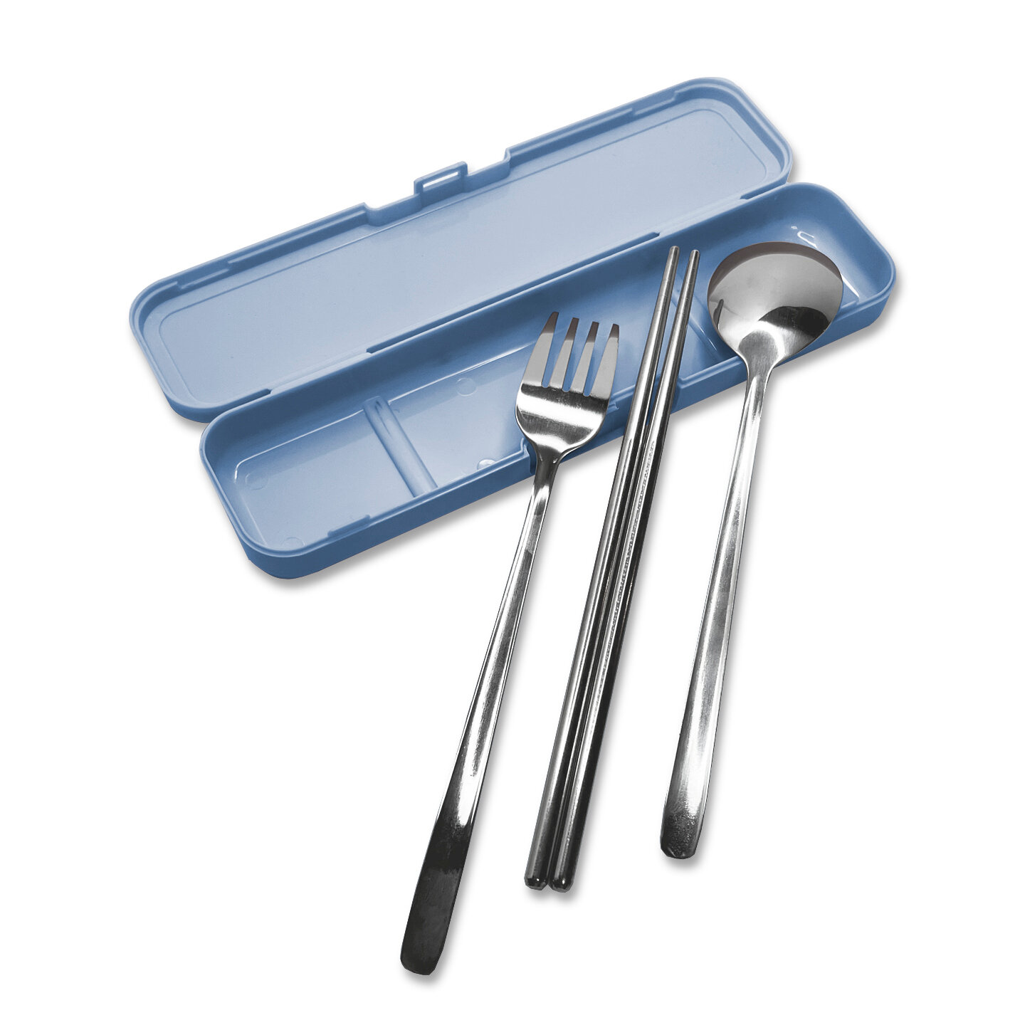 Купить Дорожный набор столовых приборов из 3 предметов (вилка, ложка , китайские палочки), походный набор в футляре, голубой