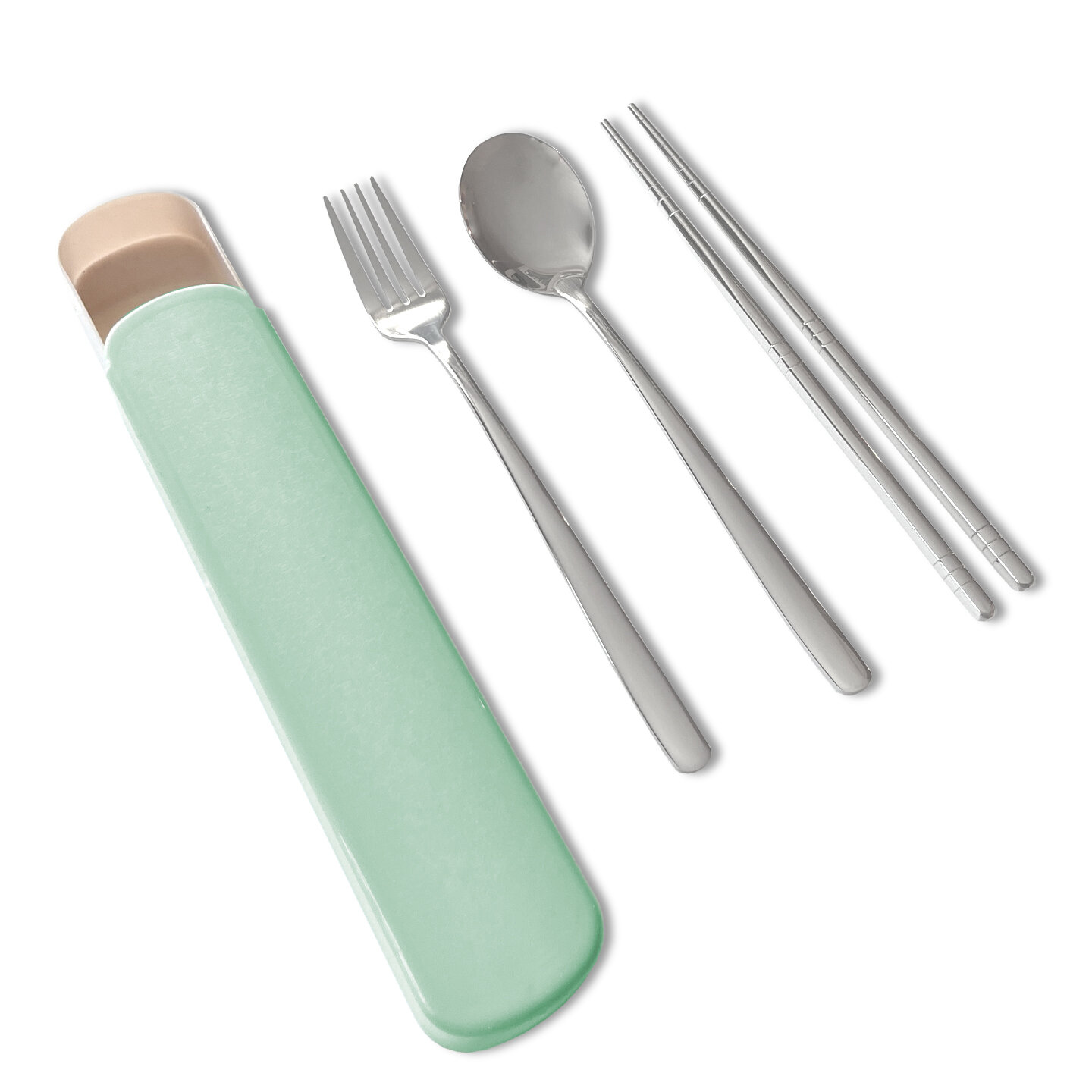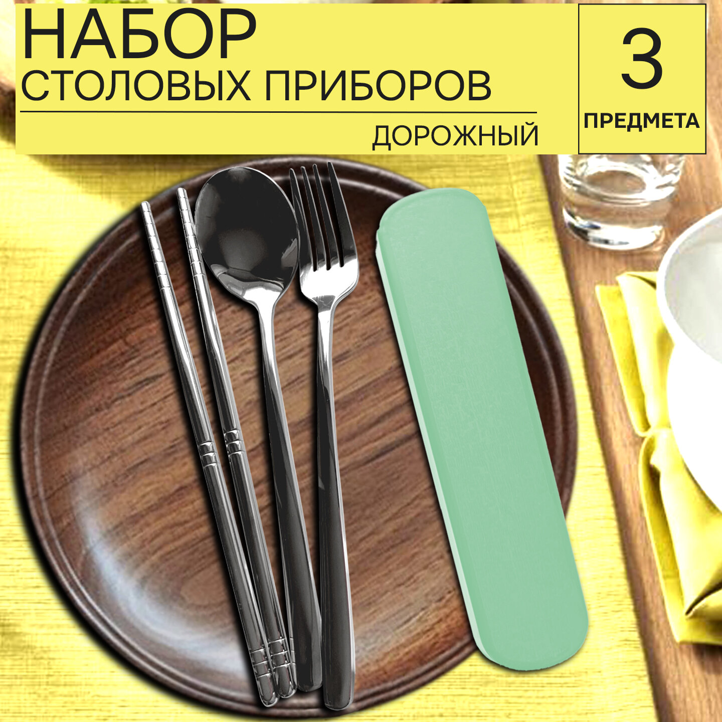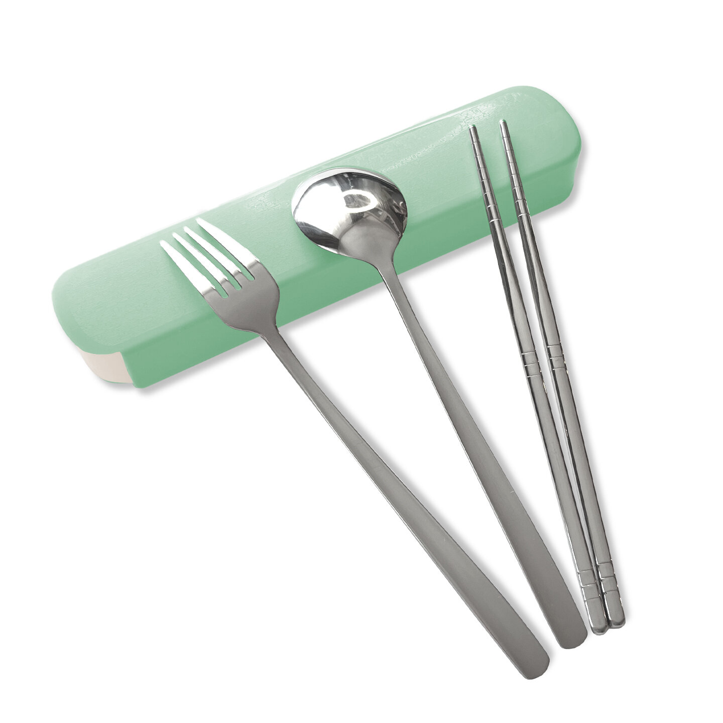 Купить Набор качественных столовых приборов, дорожный - 3 предмета в футляре (вилка, ложка , китайские палочки из нержавеющей стали), зеленый