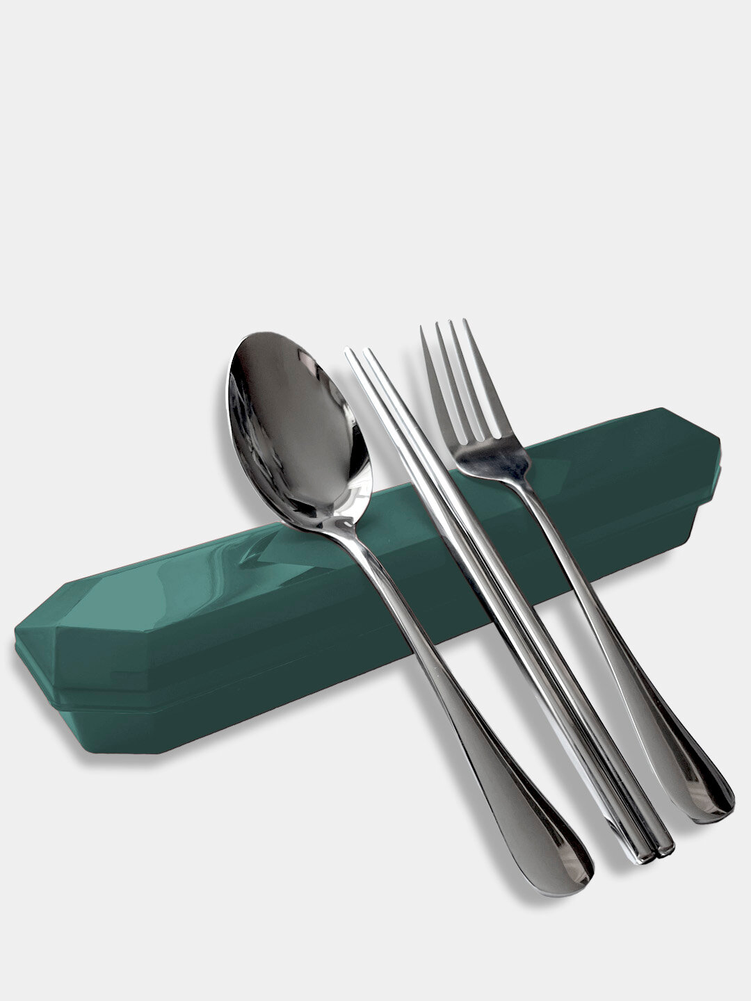 Набор качественных столовых приборов, дорожный - 3 предмета в футляре (вилка, ложка , китайские палочки из нержавеющей стали), зеленый