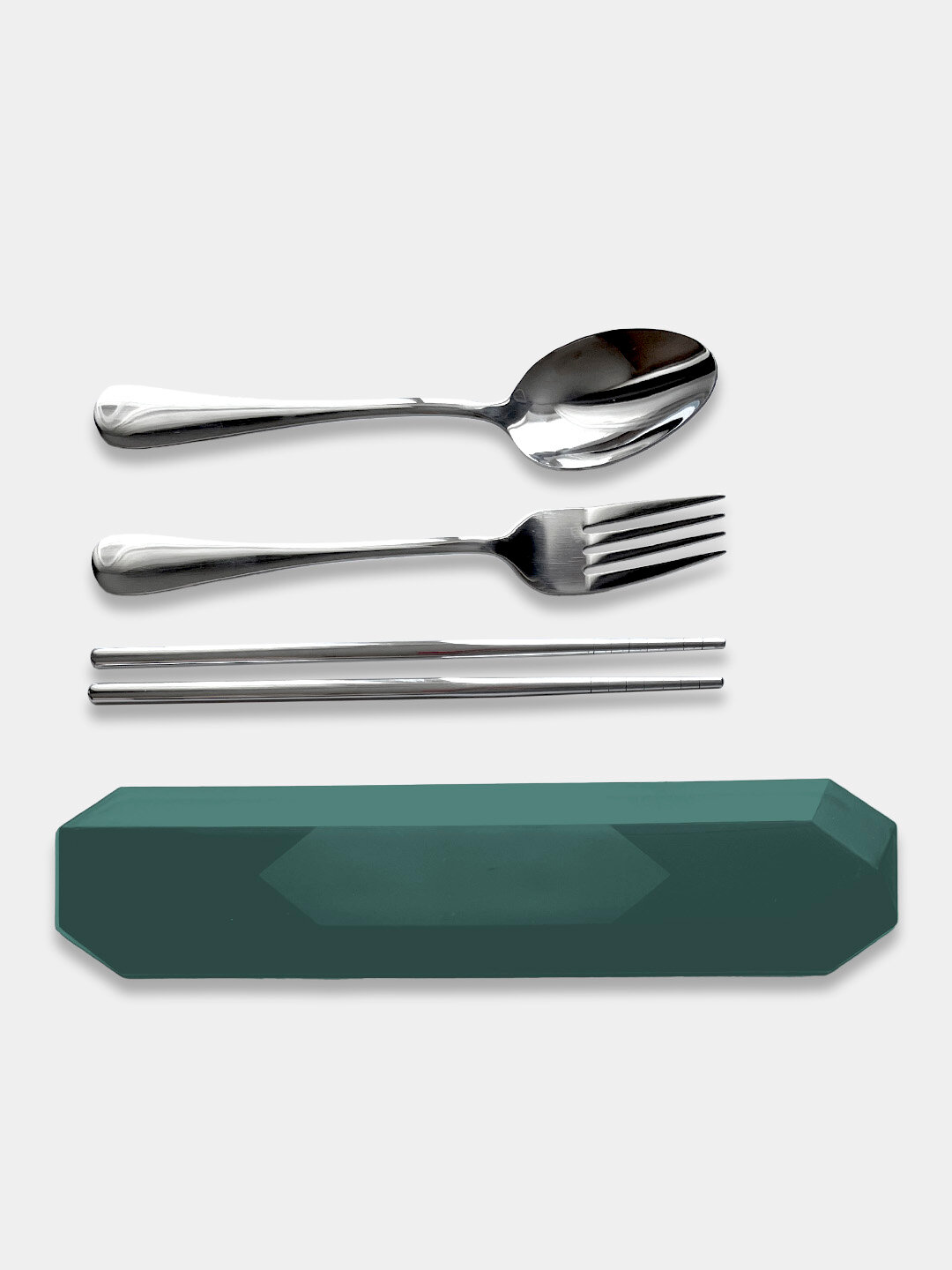 Дорожный набор столовых приборов из 3 предметов (вилка, ложка , китайские палочки), увеличена толщина металла, зеленый