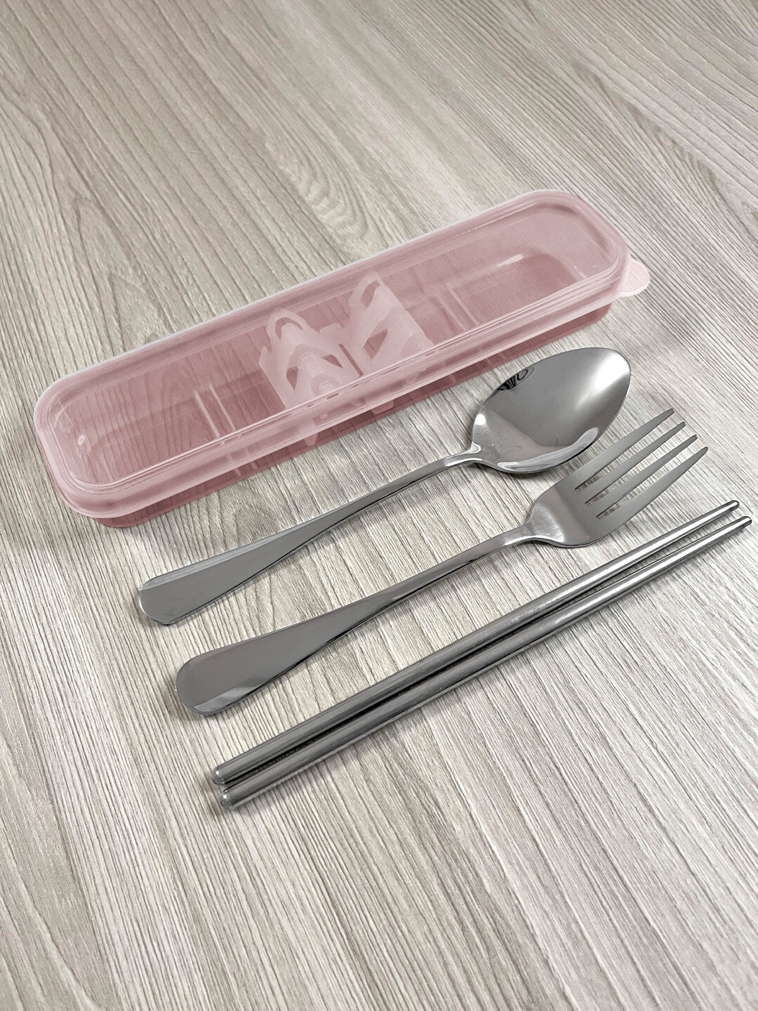 Набор качественных столовых приборов, дорожный - 3 предмета в футляре (вилка, ложка , китайские палочки из нержавеющей стали), розовый