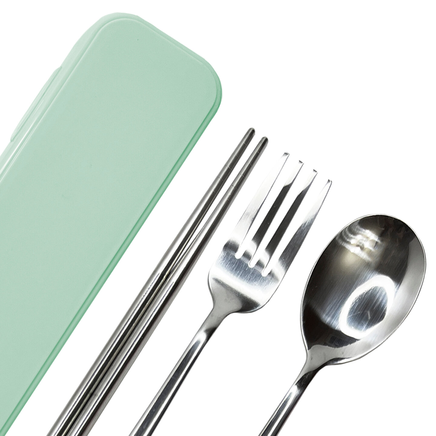 Набор качественных столовых приборов, дорожный - 3 предмета в футляре (вилка, ложка , китайские палочки из нержавеющей стали), зеленый
