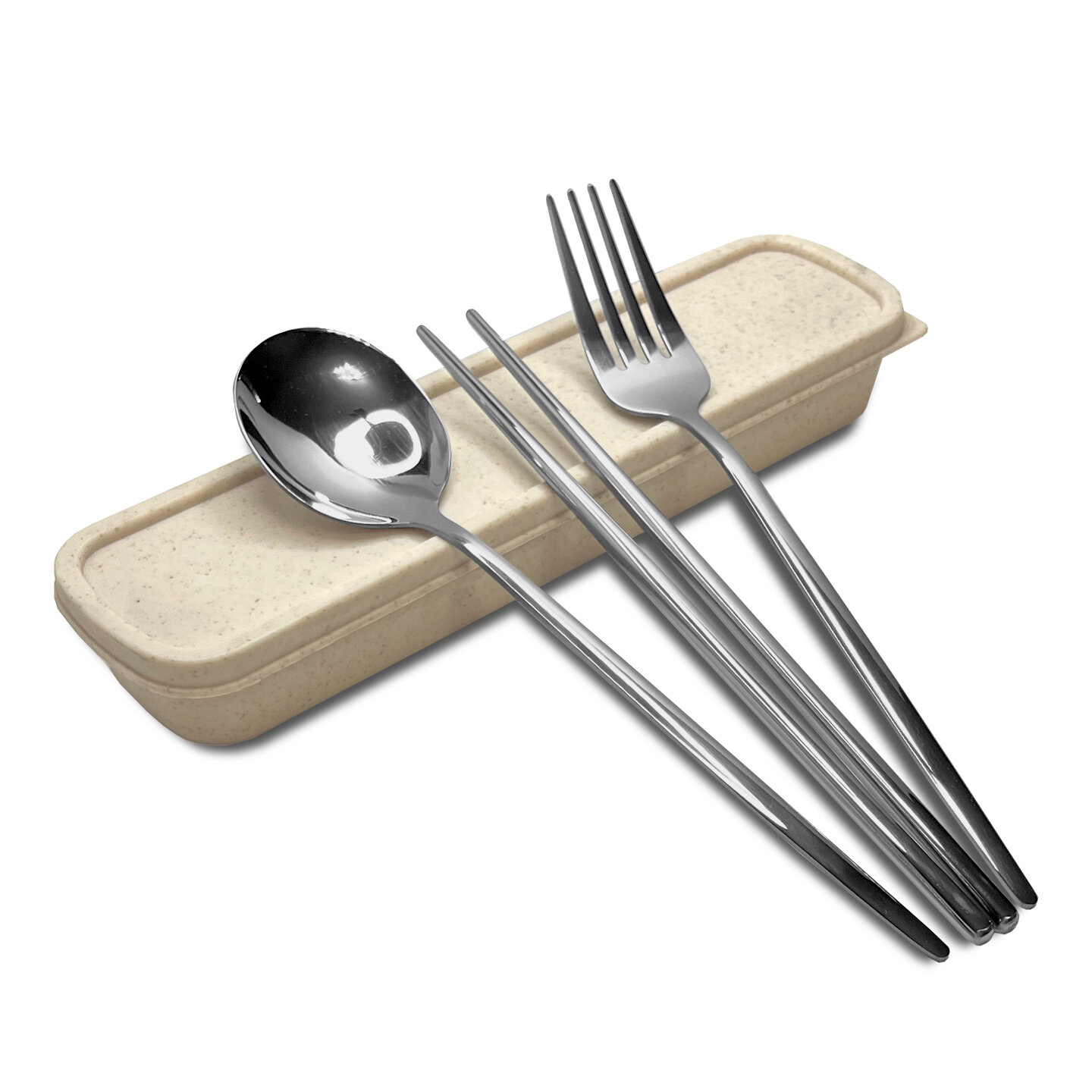 Купить Дорожный набор полноразмерных столовых приборов из 3 предметов (вилка, круглая ложка , китайские палочки), качественный походный набор в футляре, бежевый