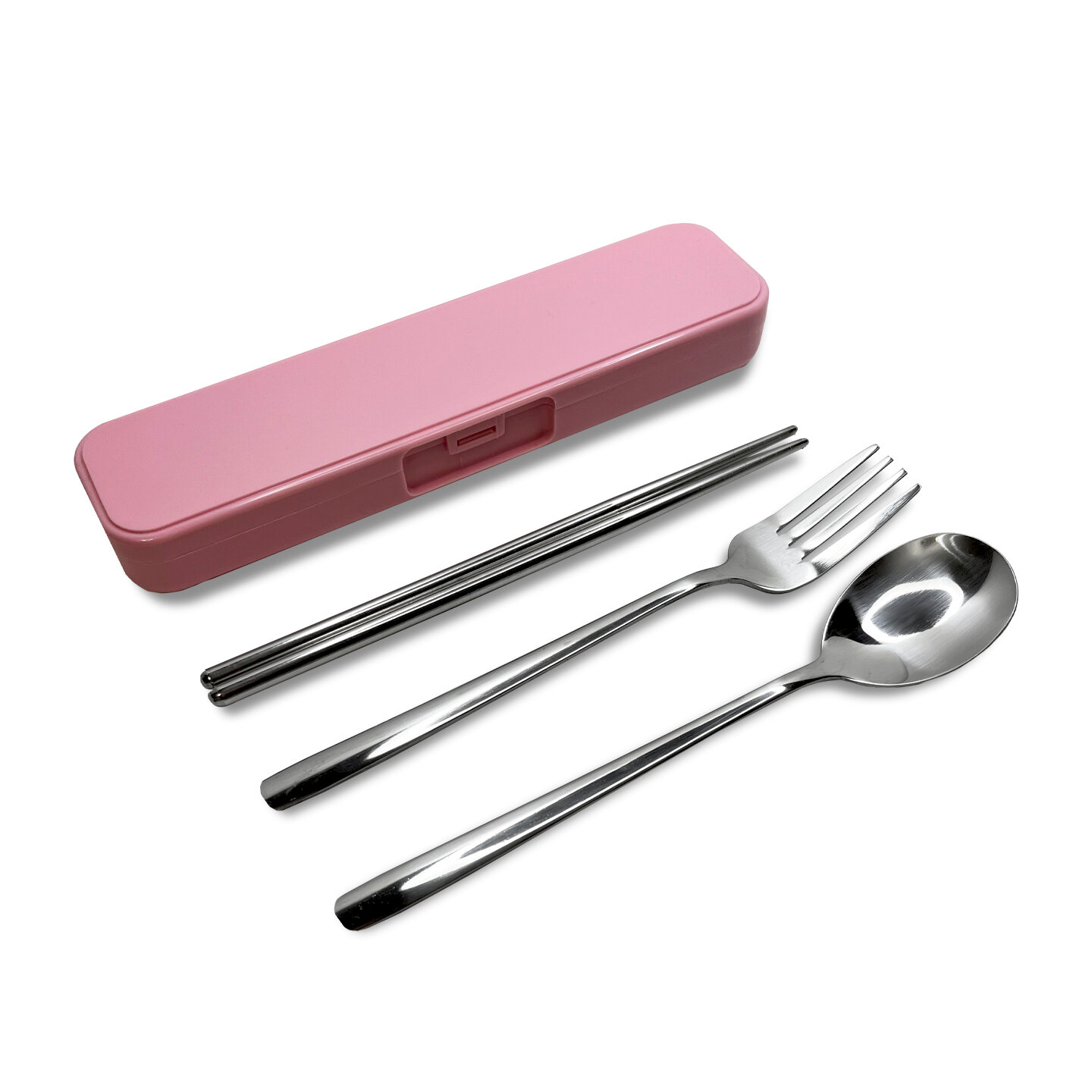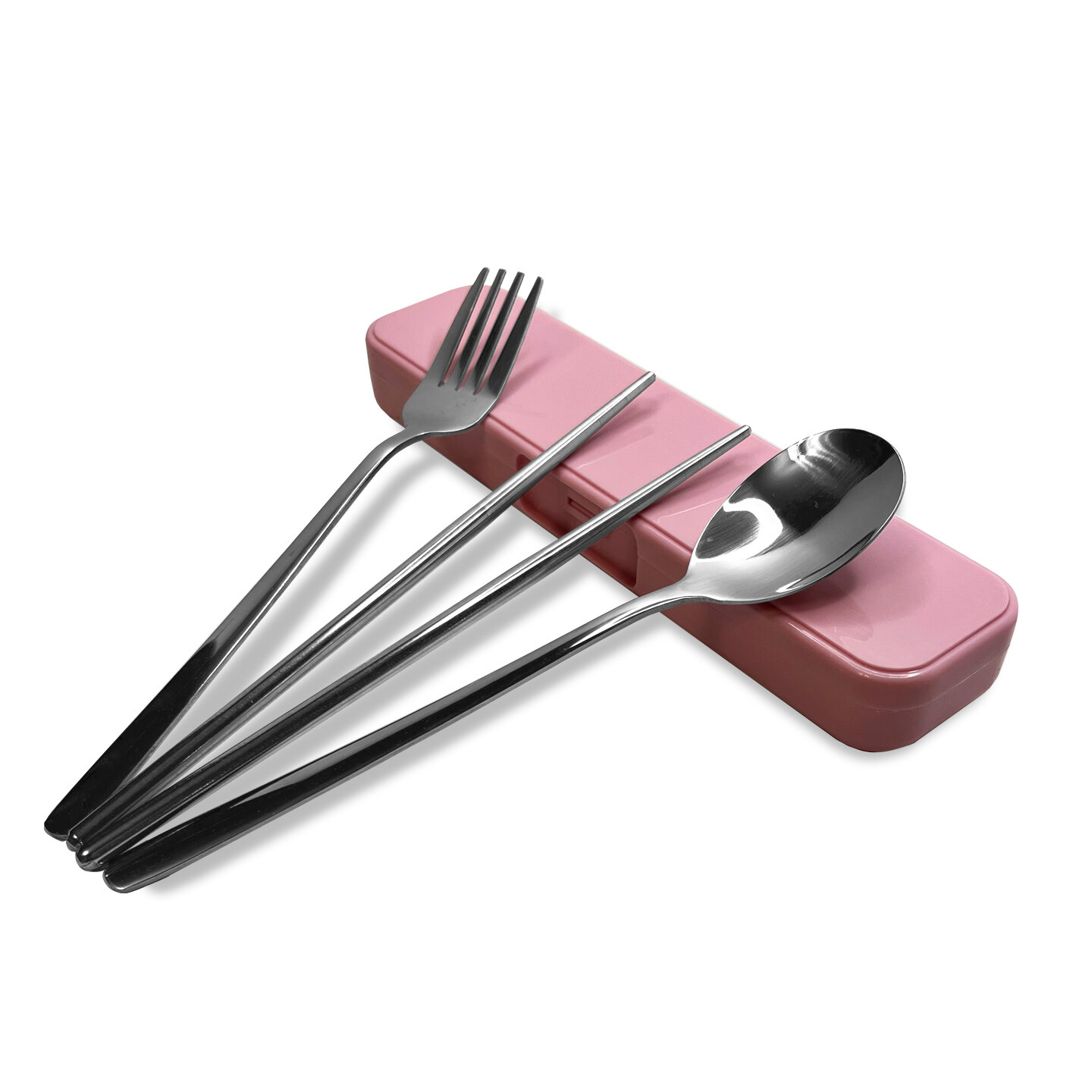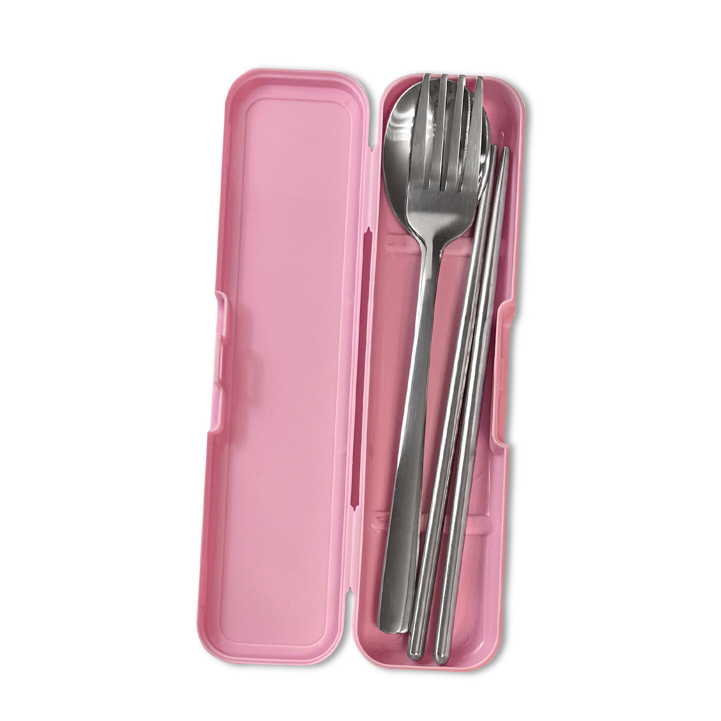Купить Дорожный набор столовых приборов из 3 предметов (вилка, ложка , китайские палочки), походный набор в футляре, розовый