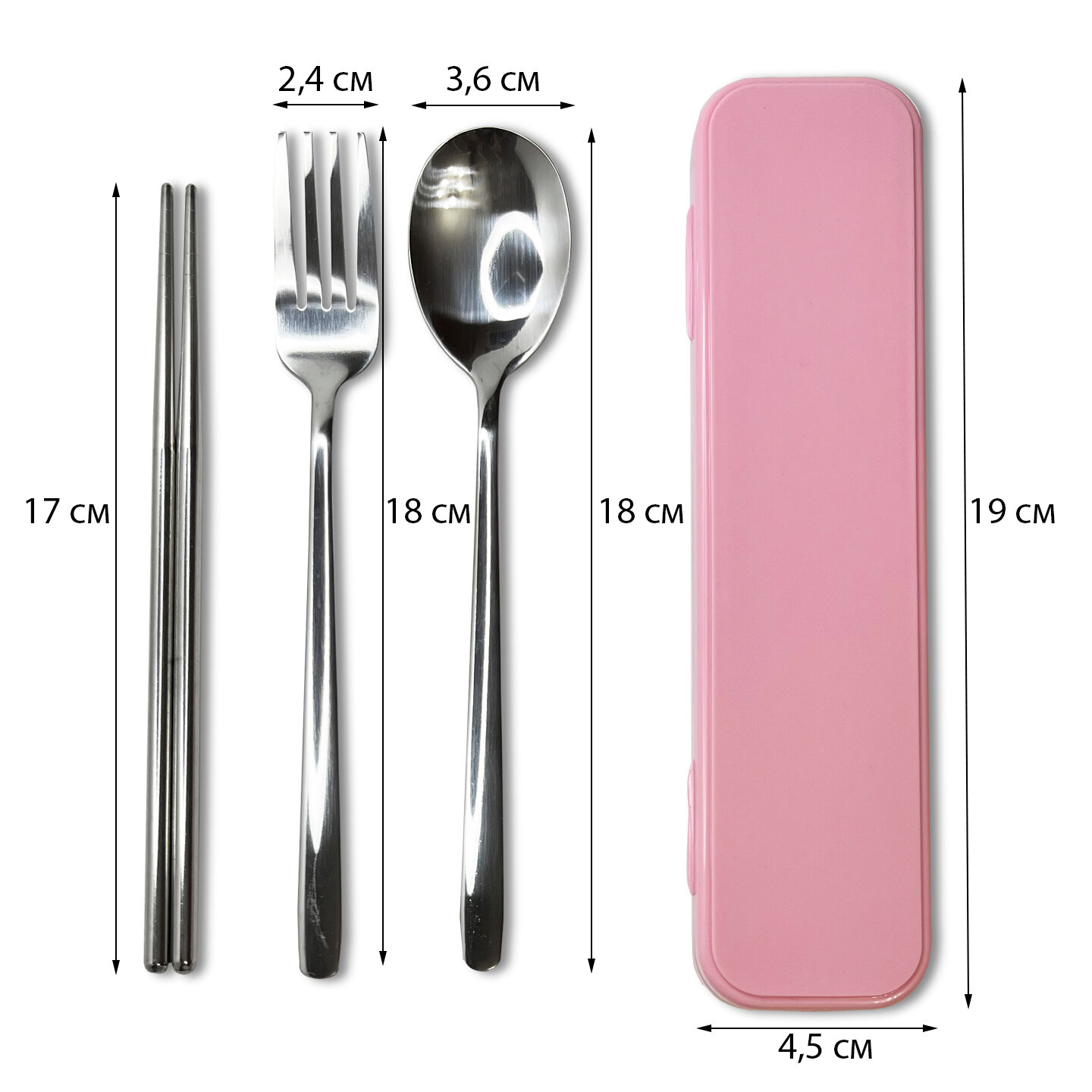 Дорожный набор столовых приборов из 3 предметов / Походный набор приборов в футляре (вилка, ложка , китайские палочки), розовый